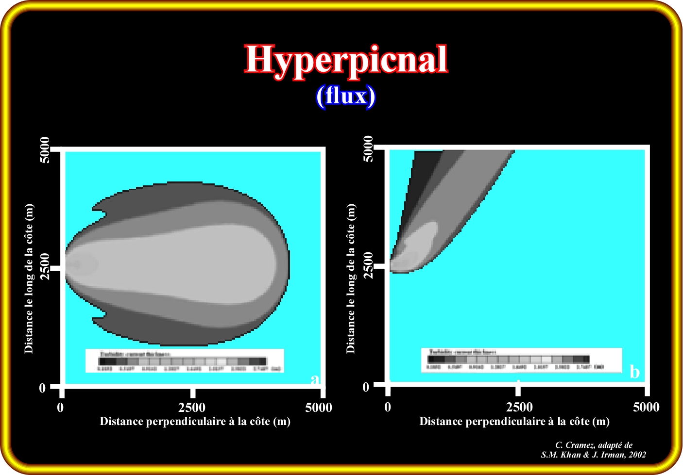 Le sort de l'eau d’un fleuve chargée de sédiments est déterminée par sa densité par rapport à la densité de la masse d'eau dans laquelle elle déchargée. Trois situations sont possibles : (i) Écoulement hyperpicnal, lorsque la densité de l'eau du fleuve est supérieure à la densité de l'eau de réception ; (ii) Écoulement hypopicnal, lorsque la densité de l'eau du fleuve ou de la rivière est inférieure à la densité de l'eau réception et (iii) Écoulement homopicnal, lorsque la densité de l'eau de rivière est égal à celle de l’eau du bassin de réception. Dans le premier cas (hyperpicnal), l'eau de rivière coule au fond du bassin de réception pouvant former un courant de turbidité. Dans le second cas (hypopicnal), les sédiments se diffusent à la surface du bassin de réception et tombent, peu à peu, au fond comme des hémipélagites. Dans le troisième cas (homopicnal), l'eau entrante est mélangée avec l'eau de réception et les sédiments transportés se déposent pour former une barre d’embouchure. Les cas les plus fréquents sont, bien sûr, les courants hyperpicnaux et hypopicnaux. La concentration critique de sédiments à partir de laquelle l'eau d'une rivière est hyperpicnal ou hypopicnal peut être calculée facilement. La densité d'un courant dépend de la densité du fluide, des sédiments et de la concentration de sédiments qu'il transporte. La densité de l’eau de mer et dépendant de la salinité et de la température. Ainsi, la concentration critique de sédiments pour qu’un courant devient hyperpicnal, par exemple, dépend du climat et de la configuration de la circulation de l'océan au moment du dépôt. Dans cette figure est illustrée une simulation d'entrée d’un hyperpicnal dans la mer Adriatique (rivière Potenza). Dans le diagramme de gauche, les auteurs ont supposé qu'il n'y avait aucun courant littoral parallèle à la ligne de côte. Dans celui de la droite, ils ont admis la présence d'un courant littoral de 50 cm / s parallèle à la ligne de côte, lequel a interagi avec l’écoulement hyperpicnal. La durée de cette simulation a été de 4 heures. Il est possible que beaucoup de courants de turbidité responsables des cônes sous-marin cône profonds aient été formés dans ces conditions.