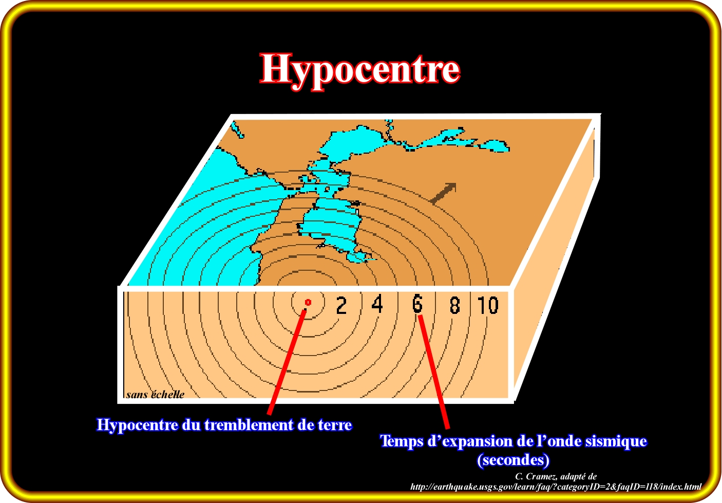 Par rapport à un tremblement de terre, l'hypocentre est le foyer du tremblement de terre, tandis que par rapport à une explosion nucléaire, l'hypocentre est le point zéro de la surface. L’hypocentre d’un tremblement de terre est point où l'énergie de déformation stockée dans les roches est libérée par la première fois. Il marque le point où la faille, par exemple, commence à se former, ce qui se produit dans la profondeur focale sous l’épicentre (point sur la surface de la Terre qui est directement au-dessus de l’hypocentre ou foyer, (point d’où un tremblement de terre ou une explosion souterraine provient). La profondeur focale peut être calculée à partir des mesures basées dans la propagation des ondes sismiques. Comme dans tous les phénomènes ondulatoires, il y a une certaine incertitude dans les mesures, laquelle augmente avec la longueur d'onde. La profondeur focale de la source des ondes de grande longueur (fréquence plus basse) est difficile à déterminer avec précision. Les tremblements de terre très forts rayonnent une grande partie de l'énergie libérée en ondes sismiques avec des longueurs d'onde très grandes. On peut dire un fort tremblement de terre libèrent de l'énergie à partir d'une masse rocheuse très grande. N'oublions pas qu'un tremblement de terre (ou séisme) est le résultat d'une libération soudaine d'énergie dans la croûte terrestre qui crée des ondes sismiques. Ainsi, la sismicité ou activité sismique d’une région se réfère à la fréquence, type et taille des tremblements de terre que la région a souffert dans une période de temps significative. La magnitude des tremblements de terre est mesurée avec sismographes (dispositifs qui enregistrent les ondes sismiques) et est classiquement considérée à partir de 3, une fois que les tremblements de terre avec une magnitude inférieure sont presque toujours imperceptibles, tandis que ceux de la magnitude de 7 ou plus font des ravages sur de grandes surfaces. L'intensité de mouvement produit par un tremblement de terre est mesurée sur une échelle de Mercalli modifiée : (1) Discret ; (2) Très faible ; (3) Faible ; (4) Modéré ; (5) Fort ; (6) Très fort ; (7) Très forte, (8) Ruineux ; (9) Catastrophique ; (10) Destructeur ; (11) Catastrophique et (12) Cataclysmique. Ce dernier, qui est caractérisé par le déplacement de grandes masses de roches, topographie déformée, objets jetés en l'air, n'a jamais été enregistrée dans la période historique.