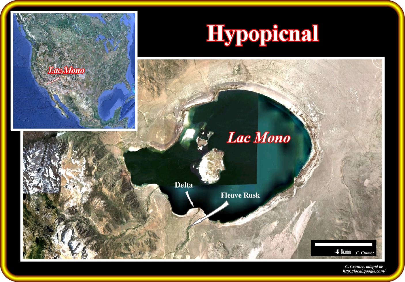 Lorsque l'eau d'un courant chargée de sédiments entre dans un autre corps d'eau (bassin versant), trois choses peuvent se produire : (i) La densité de l'eau du fleuve peut être supérieure à la densité de l'eau de réception (écoulement hyperpicnal) ; (ii) La densité de l'eau de la rivière est égal à celle de l’eau de réception (écoulement homopicnal) et (iii) La densité de l'eau de rivière est inférieure à la densité de l'eau de réception (écoulement hypopicnal). Dans le premier cas, l'eau de la rivière coule au fond du bassin de réception et peut former un courant de turbidité. Dans le second, l'eau entrante est mélangée avec de l'eau du bassin versant et les sédiments sont déposés formant une barre d’embouchure. Dans le troisième cas, les sédiments sont dispersés sur la surface du bassin de réception et peu à peu, se déposent au fond formant des hemipelagites. Un écoulement hypopicnal se forme quand l’eau d’un rivière peu dense entre dans une masse d'eau de haute densité. Dans ces conditions, l'eau de la rivière lors de l'entrée dans le bassin de réception s’écoule vers le large déposent, progressivement, les fractions argileuses qu'elle transportée en suspension formant un prodelta. Les particules argileuses laissent d’être en suspension par floculation, c'est-à-dire, par l'agglutination des particules due à la création, par l'eau de la mer, de particules chargées négative et positivement. Cette photo illustre l'embouchure de la rivière Rusk dans le lac Mono (bassin versant). Le débit de la rivière est hypopicnal, ce qui signifie que la densité de l'eau du lac Mono est supérieure à la densité de la rivière Rusk. Ainsi, lorsque la vallée de la rivière est inondée la montée du niveau du lac, l'eau douce de la rivière en rentrant dans le lac flottant sur l'eau du lac ce qui rend la zone deltaïque très productive au point de vue écologique. Notons que dans cette photo le delta construit par la rivière Rusk est parfaitement visible.