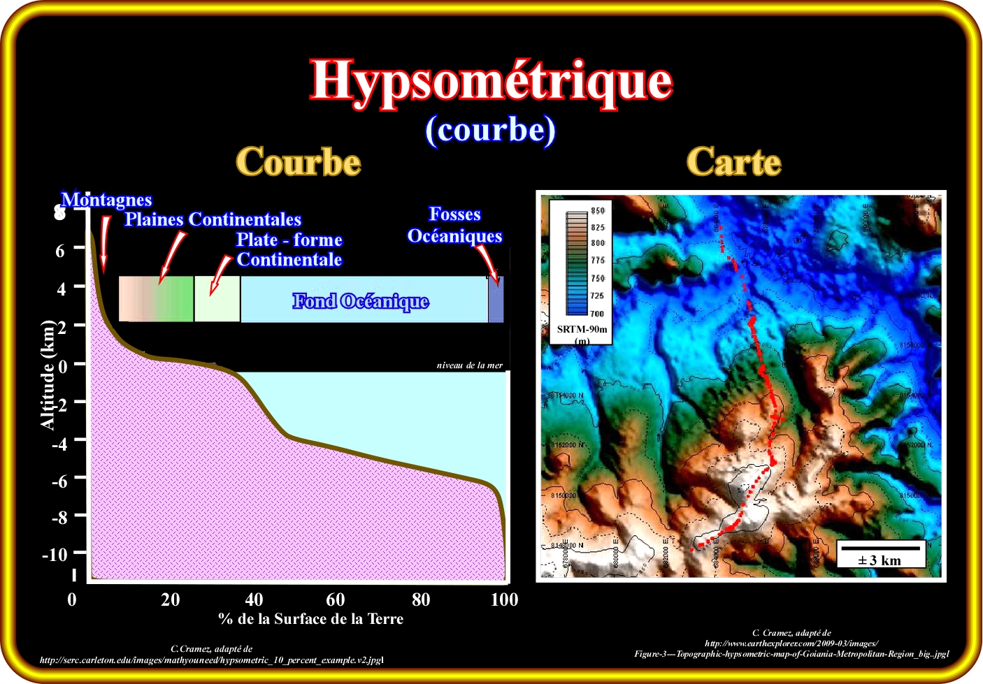 Il ne faut pas confondre une carte hypsométrique, comme celle illustré, à la droite, dans cette figure (carte topographique) et une courbe hypsométrique, comme celle illustrée à gauche. Une courbe hypsométrique est une fonction empirique de la distribution cumulative des élévations d’une région. Les différences entre les courbes hypsométriques de certaines régions suggèrent qu'elles ont été façonnées par des processus géomorphologiques différentes. Ceci est, souvent, facile à reconnaître par l'analyse du système de drainage (configuration des ruisseaux, rivières et lacs d'une région donnée). En effet, les systèmes de drainage dentritico-parallèle, rectangulaire, radial, etc., traduisent des structures rocheuses et processus géomorphologiques différents. Une courbe hypsométrique peut être considérée comme une fonction continue et représentée graphiquement comme une projection XY, dans laquelle l'altitude est l'axe vertical (axe y) et la surface dans l’axe horizontal (axe x). Une courbe hypsométrique peut, aussi, être représentée de forme non-dimensionnelle ou normalisée par les valeurs l'élévation maximale et la surface, ce qui permet d'évaluer la similitude des bassins fluviaux. En d'autres termes, une courbe hypsométrique (ou courbe hypsographique, comme certains géoscientiste l'appellent) est une courbe de fréquence cumulée de l’altitude de la surface de la Terre. Essentiellement, il s'agit d'un graphique montrant la proportion de la superficie des terre qui existe dans plusieurs niveaux projetant la surface relative par rapport à la hauteur relative. Dans la courbe hypsométrique de la superficie terrestre totale, il y a deux fréquences maximales de 100 et 4700 mètres, qui correspond au niveau moyen des zones continentales et des fonds marins. Une courbe hypsométrique est, généralement, utilisée pour démontrer que la Terre a deux types de croûte : (i) Continentale et (ii) Océanique. La courbe, comme illustré ci-dessus, représente le pourcentage de surface de la Terre au-dessus d’une élévation. C’est pour cela que l'axe horizontal est appelé " % de la Surface de la Terre », car il indique le pourcentage, tandis que l'axe vertical souligne l’élévation au-dessus ou en-dessous-dessus ou en dessous du niveau de la mer.