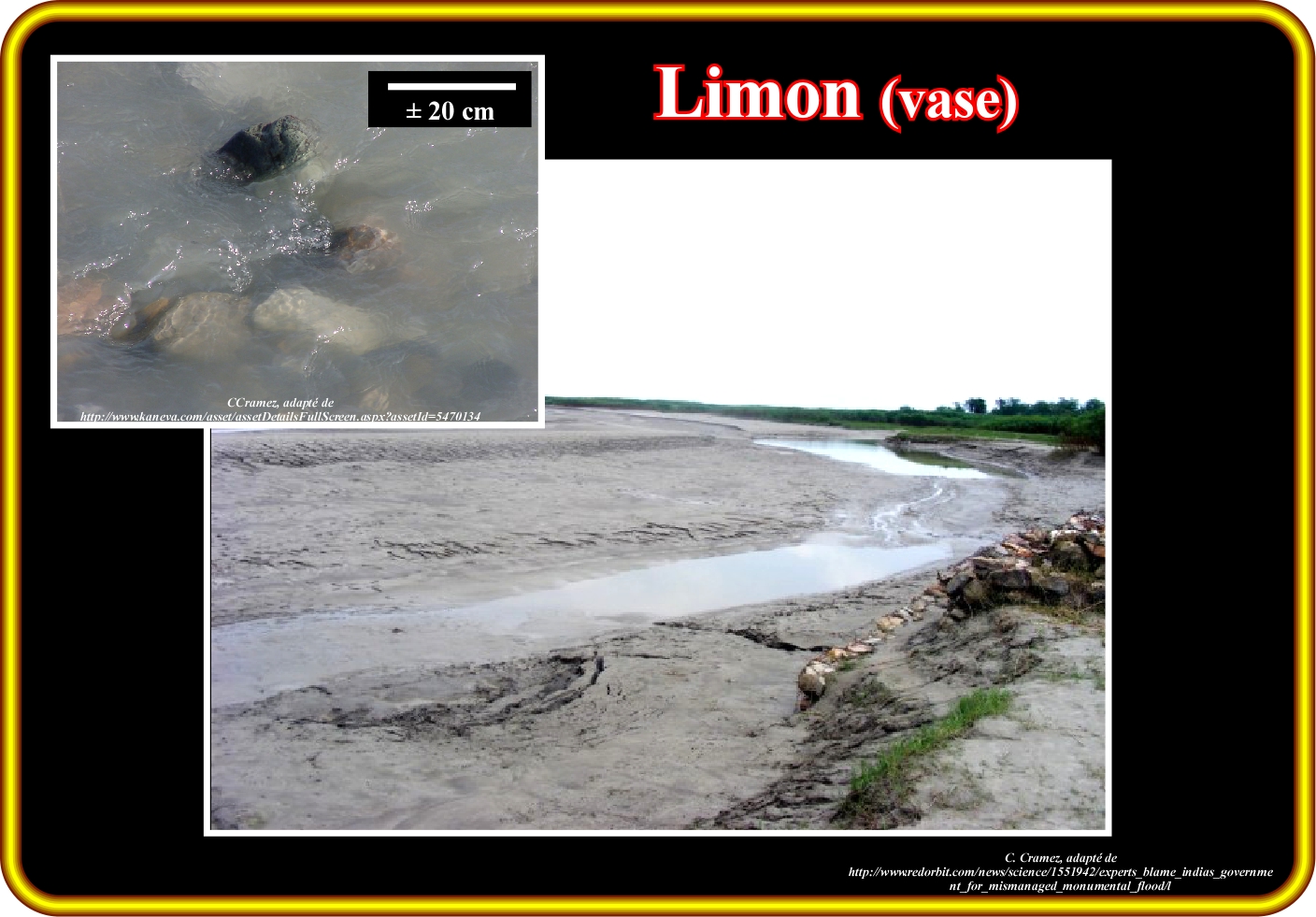 Sol ou roche provenant d'un matériel granulaire avec une granulométrie entre le sable et l'argile. Le limon (vase) peut apparaître comme un sol ou comme un sédiment soit en suspension dans la surface d'un corps d'eau soit déposé sur le fond.
