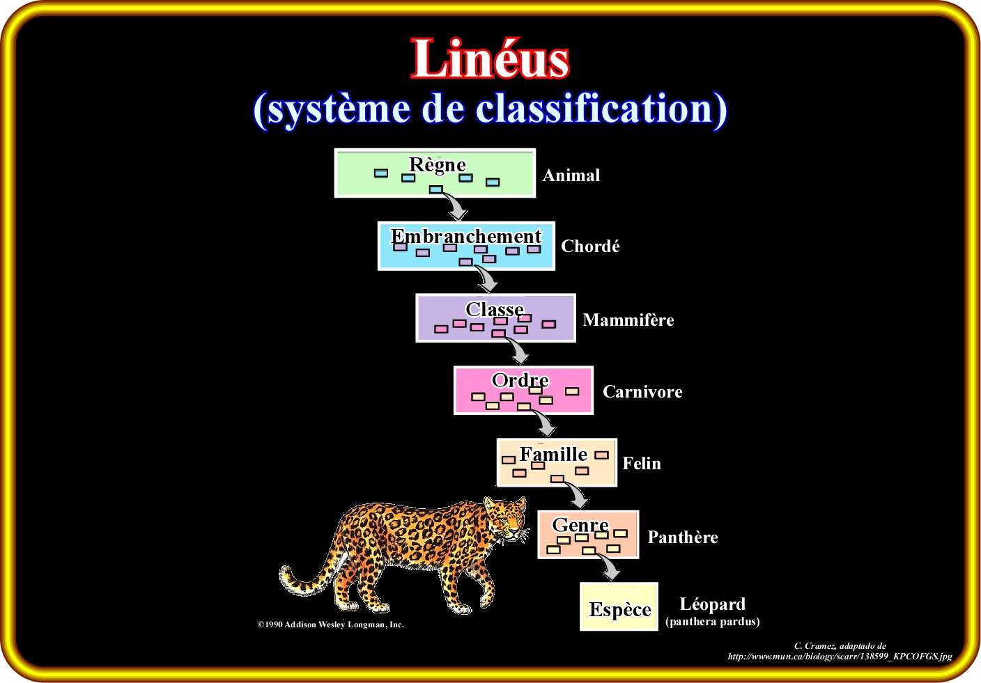 Ce système de classification a été développé par Carolus Linnaeus (connu, souvent, sous le nom de Carl von Linné) au XVIIIe siècle, pendant le grand développement de l'histoire naturelle. Comme illustrée dans cette figure, la taxonomie de Linné classe les êtres vivants dans une hiérarchie, en commençant par les Règnes. Les règnes sont divisés en branchements. Les branchements sont divisés en classes, puis en ordres, familles, genres et espèces (dans chacune de ces divisions, il y a subdivisions). Les groupes d'organismes dans n’importe quel de ces divisions sont appelés taxa (singulier taxon) ou groupes taxonomiques. Quand un géoscientiste classifie un nouvel insecte, par exemple, il cherche a le placer au sein d'une catégorie existante, s’appuyant basée sur une logique établie, et vérifie à quelle famille il appartient pour finalement donner nom le plus approprié pour cette espèce. Une qualité de la taxonomie de Linné est qu'elle peut être utilisée pour développer un système simple et pratique pour organiser les différents types d'organismes vivants. L'aspect le plus important est l'utilisation générale de la nomenclature binomiale, la combinaison d'un nom générique et d’un nom spécifique (par exemple syriacus), pour identifier l’espèce. Ainsi, par exemple, l'hibiscus syrien est uniquement identifié par le binôme Hibiscus syriacus (Règne : Plantes ; Embranchement : Magnoliophyta ; Classe : Magnololiophyta ; Ordre : Malvales ; Famille : Malvaceae ; Genre : Hibiscus ; Espèce : Hibiscus syrianis). Aucune autre espèce de plante peut avoir ce binôme. Ainsi, à toutes les espèces se peut donner un nom unique et stable. Les règles de nomenclature pour tous les types d'organismes vivants. Dans le système taxonomique de Linné, ont été adopté par la plupart des biologistes professionnels. Les règles régissant la nomination et classification des plantes et champignons sont contenues dans le Code International de Nomenclature Botanique, maintenu par l'Association Internationale pour la Taxonomie Végétale. Des codes similaires existent pour les animaux et bactéries. Les scientifiques suivent ces codes afin que les noms des organismes soient les plus clairs et stables possibles. (Http : / / pt.wikipedia.org / wiki / Taxonomie_de_Lineu).