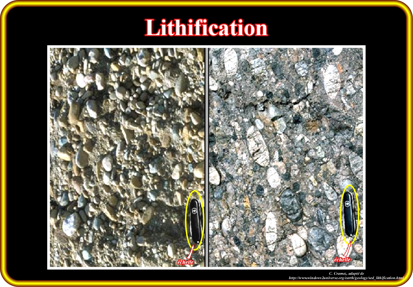 Un sédiment, qu’il soit deutogène (d’origine secondaire, c'est-à-dire, clastique ou détritique) ou protogène (d’origine primaire, c'est-à-dire, formé par précipitation) n’est pas une roche sédimentaire (endogène par contraste exogène) avant que les grains s’agglutinent les uns aux autres. Le matériel qui adhère les grains les uns aux autres, et qui est appelé ciment, est dans la plupart des cas un sédiment protogène (minéral formé lorsque l'eau passe à travers les espaces libres entre les sédiments). Si l'eau (eau de mer ou de souterraine) contient les produits chimiques nécessaires, se forment des cristaux entre les grains qui les adhère les uns contre les autres. La calcite, quartz, et parfois de l’hématite, forment, souvent, le ciment des roches sédimentaires. Les photographies, illustrés dans cette figure, soulignent la différence entre un tas de sédiments (photo de gauche), et une roche sédimentaire composée, pratiquement, par les mêmes éléments (photo de droite). La transition de l'une à l'autre est la lithification. Un empilement de sédiments, comme dans la photo de gauche, se transforme plus rapidement en une roche sédimentaire quand plus enterrée elle est, car la pression géostatique serre les grains les uns contre les autres. Cependant, le processus de transformation, c’est-à-dire, la lithification peut durer plusieurs centaines de milliers d'années. Certains sédiments protogènes se lithifient plus par recristallisation des minéraux, qui les composent, que par cimentation. L'exemple typique est la formation de beaucoup de calcaire et argiles, qui nécessitent une recristallisation, sur place, des grains sédimentaires. Dans ce processus, les minéraux recristallisent en réponse à un changement d'environnement chimique (pH augmenté), car certains minéraux sont plus stables que les autres dans certaines conditions. Lorsque les grains minéraux recristallisent (grains entiers ou seulement les bords des grains anciens), ils grandissent ensemble créant de nouvelles limites entre les grains, transformant des sédiments dans une roche compacte.