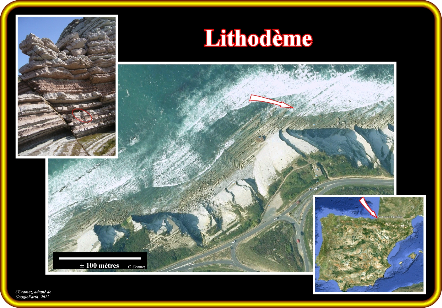 Les roches de cet affleurement forment le lithodème de Zumaya (petit village sur la côte de Guipúzcoa, à environ 35 km de Donosti - Saint Sébastien et à 75 km de Bilbao, Espagne). La lithologie correspond à une alternance de grès (granodécroissants vers le haut) et des argiles déposées dans un milieu de sédimentation profond. En réalité, le terme lithodème qui est synonyme de formation (géologique) est, très souvent, remplacé par litho-environnement. En termes modernes (stratigraphie séquentielle), ce lithodème correspond à une superposition verticale de cônes sous-marins de bassin, qui se sont déposés en association avec des chutes relatives du niveau de la mer significatives qui ont mis le niveau de la mer plus bas que le rebord du bassin. Une chute relative du niveau de la mer significative change les conditions géologiques du bassin de haut vers bas niveau, avec l'exhumation de l’ancienne plate-forme continentale, ce qui implique un déplacement vers le bassin et vers le bas de la ligne de côte et de rupture d’inclinaison de la surface de déposition côtière. Un tel déplacement détruit les profiles d'équilibre provisoire des fleuves, ce qui les oblige, par la suite, à creuser leurs lits pour qu’ils trouvent un nouveau profil équilibre provisoire. Une tel creusement augmente, fortement, l’apport terrigène et de la charge des fleuves. Comme les fleuves s'embouchent sur le talus continental, les sédiments qu'ils portaient ont été transportés le long de la pente par des courants de turbidité, qui entrent en décélération après la rupture inférieure de la pente. Dès que, dans la plaine abyssale, les courants de turbidité entrent en décélération, ils perdent compétence et les sédiments, qu’ils transporté, déposés sous la forme de cônes sous-marin de bassin. Le temps de dépôt de chaque cône (lobe) est instantanée (plusieurs dizaines ou centaines de minutes), tandis que la mince couche d’argile pélagique déposée entre les lobes, il faut plusieurs milliers d'années. Plus tard, les cônes sous-marins de bassin ont été raccourcis lors de la formation des chaînes de montagnes, qui a eu lieu dans les derniers 10 My, prenant la configuration géométrique visible sur cette photo.