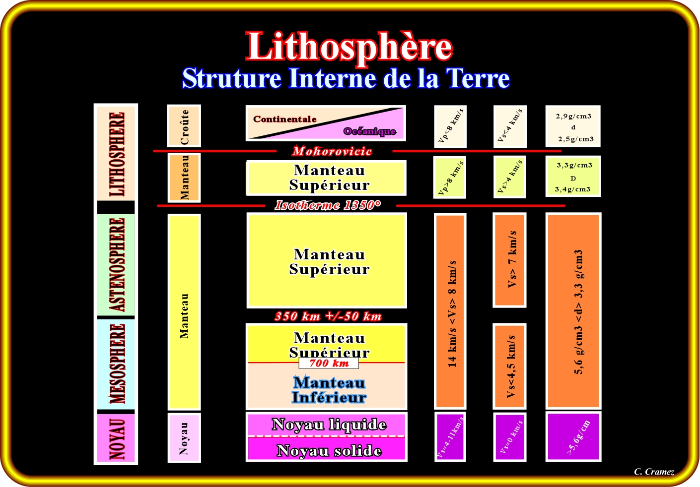 Comme on peut le voir sur ce schéma, la structure interne de la Terre peut être décrit soit du point de vue rhéologique (manière comme la matière s’écoule ou se déforme), soit pétrographique. Du point de vue pétrographique, la Terre peut être divisée en trois enveloppes, plus ou moins, concentriques : (i) Croûte qui peut être continentale ou océanique et composée par des roches exogènes (granitiques et métamorphiques) couvertes par une pellicule des roches endogènes (sédiments), dont l'épaisseur varie entre 30 et 70 km, et qui a une densité comprise entre 2.5 et 2.7 g/cm^3 (la croûte continentale inférieure se compose, principalement, de gabbros et a une densité de environ 2.8 g/cm^3 tandis que la croûte océanique est composée de roches basaltiques et gabbros recouverts par des sédiments hemi-pelágiques et pélagiques et a une densité d'environ 2.9 g/cm^3 et une épaisseur comprise entre 4 et 10 km); (ii) Manteau qui est composé de péridotites anhydres et éclogites a une densité moyenne de 3.3 à 3.4 g/cm^3 et 3.3 - 5.6 g/cm^3 dans la partie inférieure ( la limite supérieure du manteau est soulignée par la discontinuité Mohorovicic (4 - 70 km), alors que la limite inférieure est à environ 2900 km de profondeur et correspond à un changement de phase) ; (iii) Noyau qui est composé, principalement, par du fer et nickel et qui se peut diviser en une partie interne solide et une externe liquide. Du point de vue rhéologique, la Terre est divisée en quatre domaines principaux : (a) Lithosphère, qui est la couche externe rigide et qui a une épaisseur comprise entre 80 et 150 km ; sa limite inférieure correspond, à peu près, à la zone où les ondes sismiques (vp et vs) dont faible vitesse. (b) Asthénosphère, qui est une couche moins rigide que la lithosphère et qui peut se déformer par l'écoulement ; la limite inférieure de l'asthénosphère est mal définie, mais elle ne semble pas dépasser 350 km de profondeur ; (c) Mésosphère, cette couche correspond à l'ensemble de du manteau supérieure et inférieure, dont la base est à environ 2900 km de profondeur. (d) Noyau, qui est limitée entre environ 2900 km de profondeur et le centre de la Terre (± 6370 km de profondeur). Le noyau externe est liquide, tandis que le noyau interne est solide.