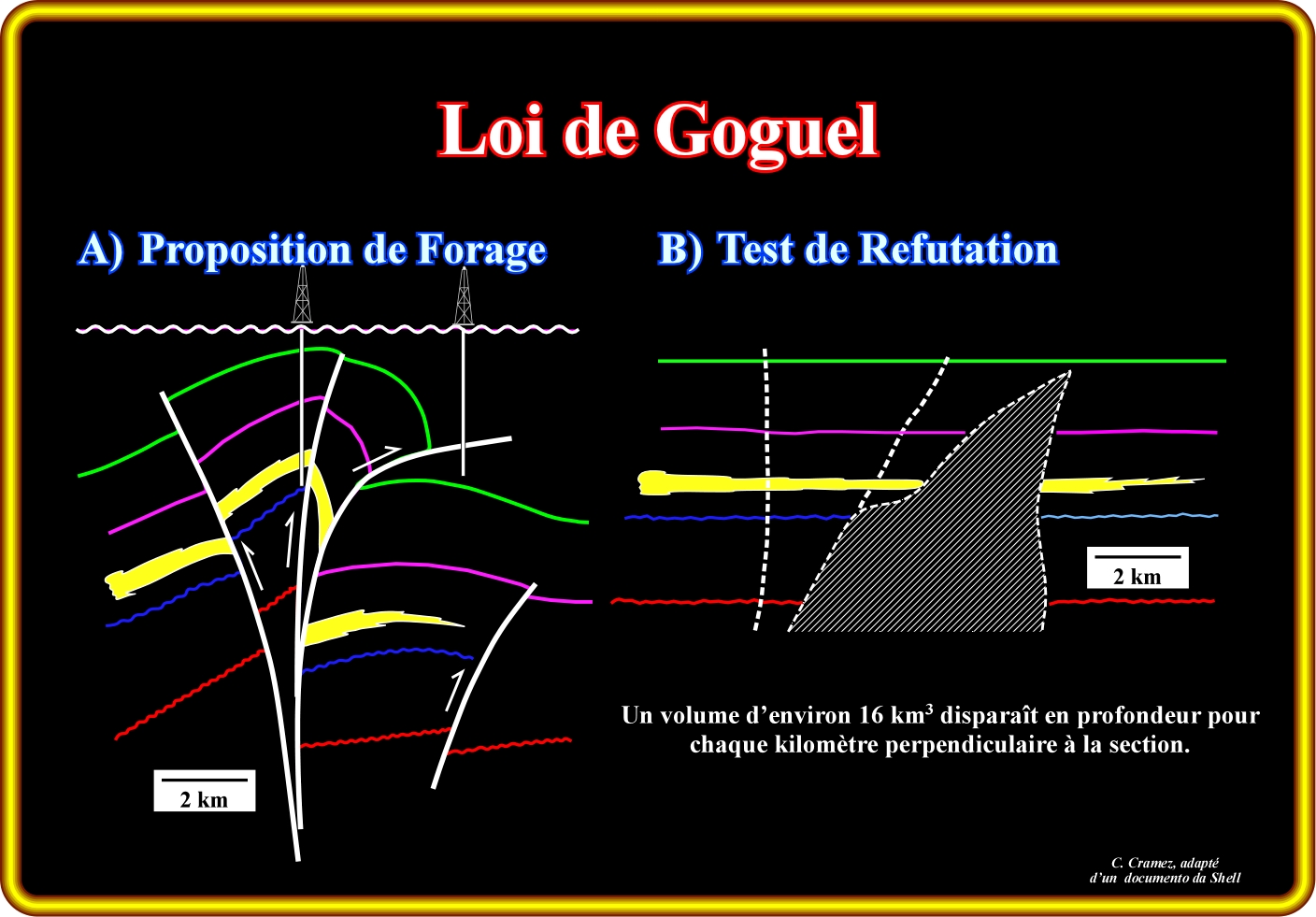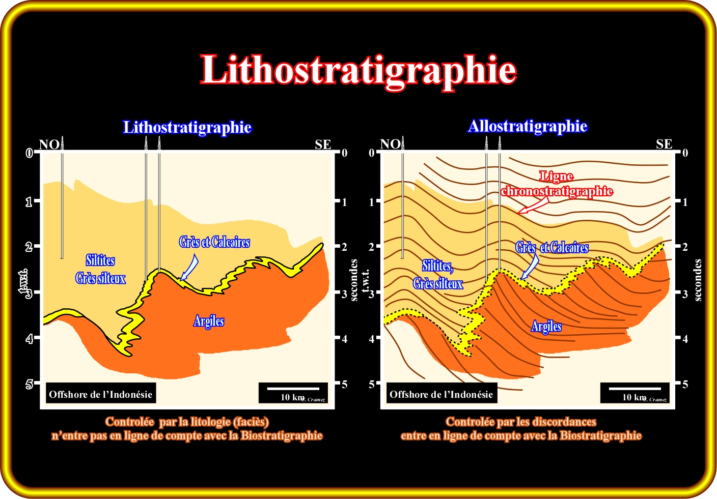 Dans cette figure sont illustrées deux tentatives d'interprétation géologiques d’une ligne sismique régionale de l’offshore de la Mahakam (Indonésie, ouest de l'île de Bornéo). Une des tentatives (à gauche) a été faite en termes de lithostratigraphie, tandis que la tentative qui est à droite a été faite en termes d’allostratigraphie. Dans un premier temps, le géoscientiste a tenté de cartographier les différents faciès (lithologie avec une faune associée) sans entrer en ligne de compte avec la biostratigraphie. Ainsi, il a mis en évidence trois zones de faciès caractéristiques : (i) Siltites et grès silteux, déposés dans une succession verticale de plaines deltaïques ; (ii) Grès et calcaires, déposés dans une succession vertical de fronts de delta d’un édifice deltaïque (ne pas confondre un delta avec un édifice deltaïque) et (iii) Argiles, déposées dans une succession de progradation de prodeltas qui dans la plupart des cas, coïncidaient avec la pente continentale (quand le bassin n’avait pas de plate-forme continental), ce qui signifie que le front du delta coïncidait, grossièrement, avec le rebord continental qui peut ou non coïncider avec le rebord du bassin. Dans l'interprétation allostratigraphique, le géoscientiste a non seulement cartographié les différents faciès, mais aussi les lignes chronostratigraphiques. Ces lignes chronostratigraphiques qui soulignent les réflecteurs sismiques les plus importants, ont permis au géoscientiste, dans une deuxième phase de l'interprétation, de reconnaître les principales surfaces sismiques (définies par les terminaisons des réflecteurs), et ainsi déduire les baisses relatives du niveau de mer significatives. Une comparaison entre ces deux interprétations permet, facilement, d’affirmer que les limites de faciès sont diachroniques et donc obliques aux lignes chronostratigraphiques qui représentent environ surfaces de dépôt. Les brusques variations des lignes de faciès suggèrent non seulement des épisodes de progradation (régressions) et de rétrogradation (transgressions), ainsi que des épisodes d’aggradation négative qui soulignent des chutes relatives du niveau de la mer significatives qui marquent les discordances importantes. N’oublions que dans une interprétation allostratigraphie, les discordances correspondent à des surfaces sismiques définies par des biseaux d’aggradation, qui limitent les différents cycles stratigraphiques.