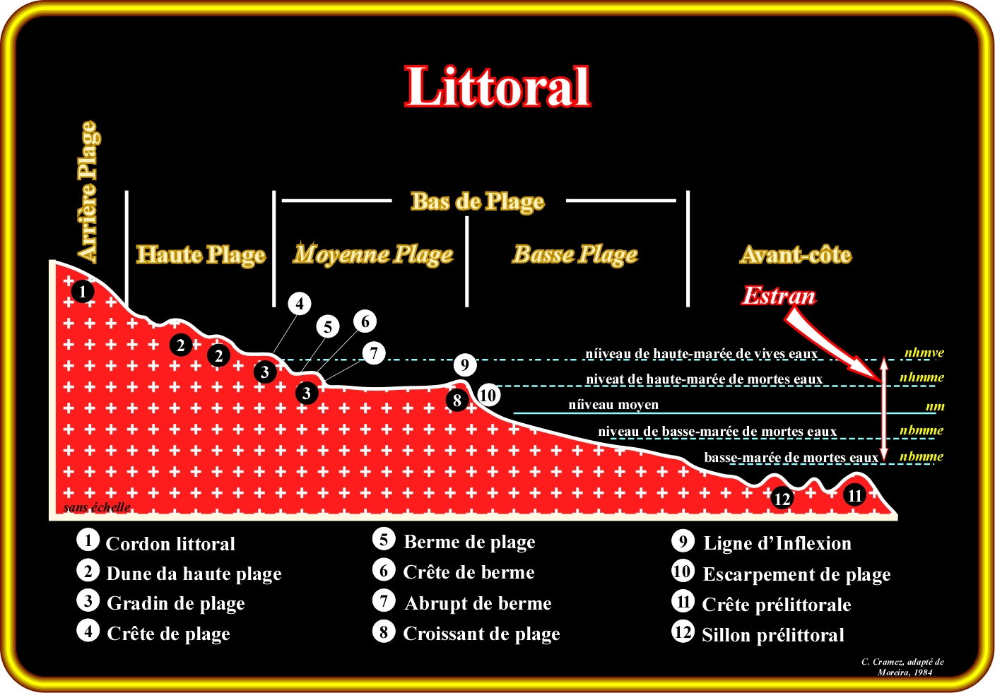 Comme illustré dans ce schéma, certains géoscientistes limitent le littoral à la bande côtière intertidale. D’autre l’étendent vers l'intérieur, par un espace dont les limites ne sont pas toujours faciles à définir, et aussi vers le large jusqu'à ce au début de la zone de déferlement. Sur la base de la répartition des biocénoses côtières (relation équilibrée des êtres vivants avec le milieu naturel), en fonction du temps d'immersion, le littoral peut être divisé en étages ou bandes, parallèles à la ligne de côte : (i) Étage supralittoral, qui comprend l'espace directement accessible par le brouillard salin au-dessus du niveau des marées hautes en eaux vives (toujours émergé) qui, à son tour, peut être subdivisé en : (a) Supérieure qui est la partie atteinte uniquement par des petites bulles d'air avec des cristaux sel et (b) Inférieure qui est la partie atteinte par l’embrun et directement par l’écume du déferlement dans la marée haute ; (ii) Étage médiolittoral qui est la partie du littoral de balancement des marées où il y a alternance d'immersions et d'émersions et qui peut également être subdivisée en : (a) Supérieur qui est la zone comprise entre le niveau de la mer moyen et de marée haute et (b) Inférieur qui correspond à la bande de plage entre le niveau de la mer moyen et de marée basse ; (iii) Étage Infralittoral qui est au-dessous que le niveau de la mer des marées basses de vives eaux (toujours immergé), lequel, aussi, peut être subdivisé en : (a) Supérieur qui est la zone entre le niveau de marée basse de vives eaux et la zone de déferlement et (b) Inférieur qui correspond à la zone de déferlement. Rappelons que les marées sont des ondes d'oscillation de faible amplitude (quelques mètres), grande longueur d'onde (plusieurs centaines de kilomètres) et de très grande période (30 à 300 secondes) qui se forment dans la mer ouverte due à l'attraction de la Lune et Soleil sur l'eau de mer. Près de la côte, ces vagues se modifient et se prolongent par des vagues de translation qui donnent lieu aux courants de marée : (1) Marée montante ou flot, qui se dirige vers la côte et provoque une accumulation de l'eau dont le maximum est appelé marée haute et (2) Marée descendante ou jusant, qui s’e dirige vers le large, écoulant, ainsi, l’eau accumulée près de la côte pendant la marée haute et dont le niveau plus bas est celui de la marée basse. Lorsque le Soleil et la Lune sont en conjonction ou en opposition, les marées sont des marées de vives eaux (avec une grande amplitude). Quand la lune est décroissante ou croissante (quadrature), la marée de mortes eaux, c'est avec des amplitudes minimales.