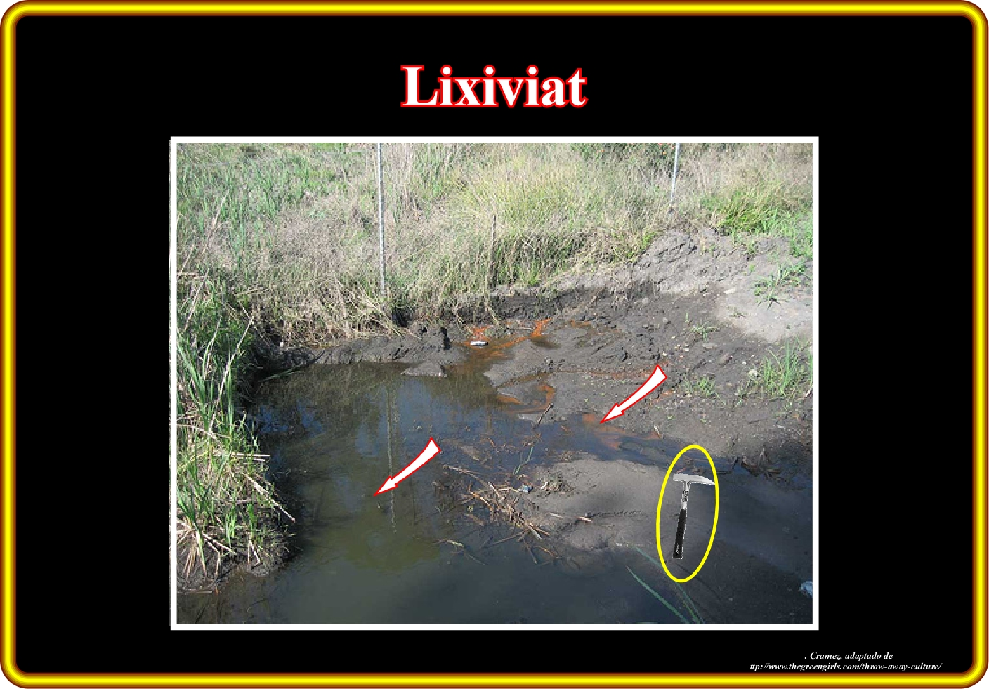 Comme l'illustré dans cet exemple, l'eau de pluie, la neige et même le brouillard peuvent dissoudre certains minéraux des roches, en particulier ceux qui se dissolvent facilement dans des solutions acides, et former des lixiviats (ou percolats) qui s’écoulent le long des pentes. Lors de l’écoulement, certains minéraux peuvent précipiter à partir du lixiviat, mais quand celui se déverse sur un courant d'eau, il est contaminé et devient impropre à la consommation. Les lixiviats plus polluants sont d'origine anthropique, en particulier, ceux créés par les débris et décharges municipaux. En fait, une fois que les ordures sont laissés à l'air libre, elles commencent à se décomposer et l'eau de pluie ou de la la neige s'infiltre à travers elles et se contamine fortement (dissolution de diverses substances). Dès que l’eau s’échappe, il forme un lixiviat. La décomposition de la matière charbonneuse qui produit une variété de produits tels que le méthane, dioxyde de carbone, aldéhydes, acides organiques (dérivé d'un alcool primaire par la perte d'hydrogène), alcools, sucres, etc., enrichit beaucoup la composition des lixiviats. La percolation de l’eau (percolation est l’action ou processus de passage d'un liquide à travers des interstices) les ordures, elle favorise et facilite la décomposition produite par l'action des bactéries et champignons. Ces types de décomposition libèrent des sous-produits et consomment très rapidement l'oxygène disponible, ce qui crée un environnement anoxique, et une augmentation de la température et une diminution du pH. Ainsi, de nombreux ions métalliques qui sont insolubles à pH neutre, se dissolvent, augmentant, ainsi, la concentration du lixiviat. Par ailleurs, la décomposition de l'eau traite également la libération, ce qui augmente le volume de lixiviat. Par ailleurs, le lixiviat réagit également avec des matériaux qui ont une faible tendance à la décomposition, telles que les cendres et matériaux de construction à base de ciment, en changeant leur composition chimique. Par conséquent, lorsque les ordures contiennent des matériaux de construction à base de plâtre, la réaction du lixiviat avec du gypse produit de grandes quantités de sulfure d'hydrogène.