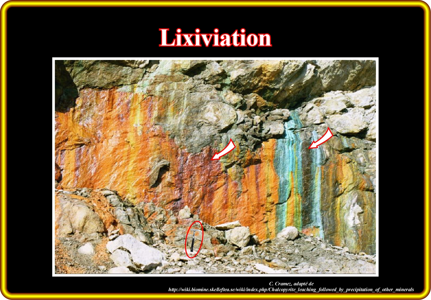 Dans certaine roches, les conditions nécessaires pour la lixiviation (dissolution et transport) et précipitation (séquestration) d'un minéral, tel que, par exemple, la chalcopyrite (CuFeS_2), sont qu’elle soit en contact direct avec la pyrite (FeS_2), laquelle peut être oxydée par la pluie, neige ou brouillard pour former de l'acide sulfurique dilué. L'acide sulfurique dissoudra et transportera le cuivre (Cu) de la chalcopyrite pour le précipiter sous forme de chrysocolle {(Cu,Al)_2 H_2Si_2O_5 (OH)_4 nH_2O} ou de la malachite {Cu_2 CO_3 (OH)_2}. Cette précipitation se produit quand le pH (acidité ou l'alcalinité d'une solution) devient neutre, ce qui arrive quand la pyrite est altérée par la pluie, neige ou brouillard et transporté vers l’aval (à la condition que la pyrite ne soit pas oxydé pendant le transport). La précipitation peut être influencée par la présence de petits horizons de roches carbonatées le long de la zone écoulement de la solution. En effet, si la solution passe par un horizon carbonaté, l'acide sulfurique est neutralisé et se dépose la malachite. De plus, comme l'air atmosphérique contient du carbone sous forme de dioxyde de carbone (CO_2), une oxydation avec d'oxygène et du dioxyde de carbone et (O_2 + CO_2) et aussi avec le monoxyde de carbone (CO), ce qui peut produire une mince couche de malachite et/ou l'azurite. En pédologie (étude des sols dans leur environnement naturel), la lixiviation correspond à la perte de minéraux et solutions organiques par percolation, c'est-à-dire, par drainage et filtration des solutions à travers un matériel poreux, tel que, par exemple, l’écoulement d'huile à travers les fractures d’une roche. Ce mécanisme de production des sols est très différent de l’autre mécanisme de production qui est l’éluviation (élimination des matériaux du sol et des horizons géologiques) qui est caractérisé par la perte de colloïdes minéraux et organiques (mélange chimique dans laquelle une substance est dispersée uniformément dans un autre). Les matériaux lixiviés et éluviationnés dans la partie supérieure des sols, où il y a une concentration élevée de matière organique et micro-organismes et où se produit la plus part de l'activité biologique des sols, se déposent dans le sous-sol formant une zone d’illuviation (dépôt de matière transportée à travers un sol) au-dessus du substratum qui peut être une roche exogène ou endogène. En géologie, la matière enlevée est sans importance, et le dépôt (dépôt d’éluviation) est le matériau restant.