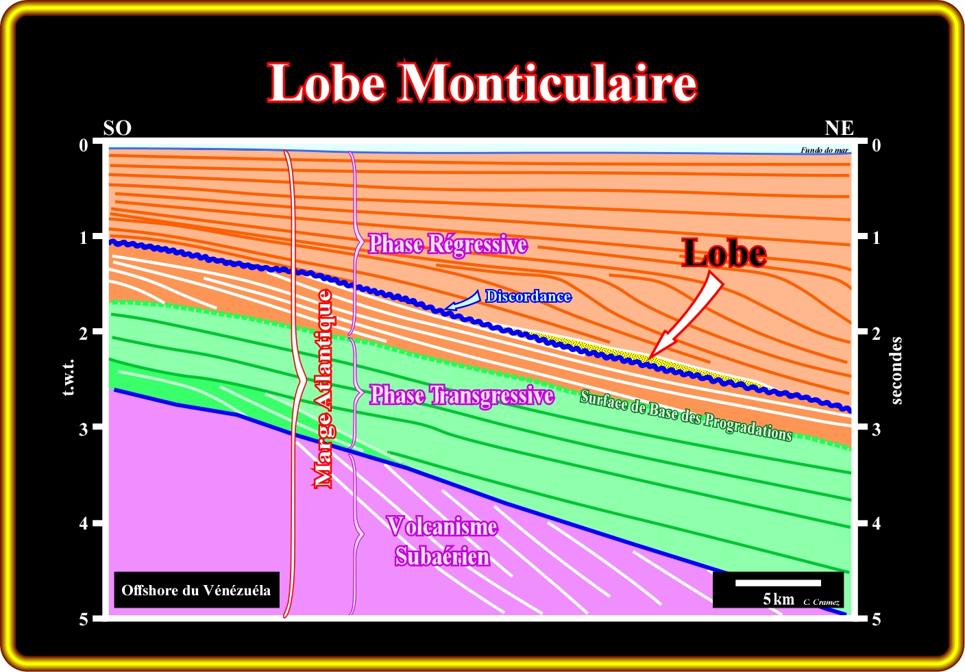 Dans cette tentative d'interprétation géologique d’une ligne sismique régionale de l'offshore du Venezuela, est illustré un lobe monticulaire composé par des sédiments deutógenes. Comme on peut le voir dans cette région (offshore de l’Orénoque), au-dessus des laves subaériennes qui se sont déposées, immédiatement, après la rupture de la Pangée, s’est déposé le cycle d’empiétement continental post-Pangée, c'est-à-dire, une marge divergente de type Atlantique. Dans cette marge on peut distinguer deux phases sédimentaires : (i) Phase transgressive phase qui est associée à la montée eustatique, induite par la dispersion des continents postérieurs à la Pangée continents et qui est caractérisée par une géométrie parallèle rétrogradante et (ii) Phase régressive, induite la descente eustatique, induite par les zones de subduction de type A et B (agglutination des continents) et qui se caractérise par une géométrie progradante. Au cours de ces deux phases, plusieurs descentes relatives du niveau de la mer peuvent avoir lieu, ce qui a créé une série de surfaces d'érosion, autrement dit, des discordances (pour des raisons pratiques une seule discordance a été cartographiée). Cette discordance, localisée à la base de la phase régressive, a déplacé vers la mer et vers le bas, la ligne de côte. Ce déplacement a exhumé toute la plate-forme continentale et le rebord continental (le bassin n'avait pas de plate-forme) et rompu les profils d'équilibre provisoire des cours d’eau qui, ainsi, sont forcés à creuser leurs lits afin de rétablir des nouveaux profils d’équilibre. Un tel creusement a augmenté, fortement, l'apport terrigène et la charge des fleuves qui en déversent les sédiments sur le talus continental créent des courants turbiditiques. Ces courants s’écoulent vers la plaine abyssale où ils déposent des lobes monticulaires, comme illustré ci-dessus (en tenant compte de la subsidence postérieur au dépôt il est facile de constater que ce lobe s’est déposé dans une plaine abyssale relativement peu profonde.