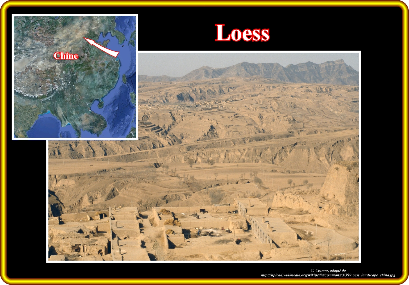 Loess (de l’allemand “Löss” en vrac) est un sol jaune, formé par les sédiments déposés par le vent, c'est-à-dire, des sédiments d’origine éolienne. Le loess se trouve en certaines parties de l'Europe (France et Pays-Bas) et principalement en Chine, particulier en Chine, en le long du fleuve Jaune, où il est largement utilisé pour la culture du riz. La définition de lœss est double : (i) Lithologique (limo calcaire) et (ii) Génétique (dépôt éolien). Le loess est formé, principalement, de silice (quartz détritique) et carbonate de calcium (CaCO3), mais contient, une moindre mesure, du feldspath, biotite (deux minéraux qui, comme le quartz, entrent dans la composition des sables) et d’argiles, souvent kaolinite (peut être agglomérée et former des grains de limon fin). Compte tenu de leur structure, le loess se caractérise par une bonne calibration granulométrique due à son origine éolienne, avec des grains ayant entre 10 et 50 microns (une taille entre 2 et 50 microns correspond à ce que les géoscientistes appellent limo ou boue). Le loess est homogène, sans stratification, mais il a une porosité très élevée résultant des traces de racines et d'une cimentation carbonatée des grains. Au cours du Pléistocène, le loess est le résultat de l'accumulation dans le sol, sous un climat froid et sec, de limo transporté, par le vent, depuis les zones sources, c'est-à-dire, dès dépôts alluviaux fluvioglaciaires, sédiments côtiers et d’estuaire, zones arides, etc.) soumis à déflation éolienne. Une dérive granulométrique vers le sable (loess sableux) peut être due à la proximité de la zone source de loess et ainsi dû à un triage éolien moins avancé. En Belgique, un région de loess sableux sépare les sable éoliens, sépare les sables de Campine du loess de Hesbaye. Une granulométrie plus grossière peut, également, être due à un enrichissement de matériaux local disponibles en abondance. Comme l'illustre dans cette figure, lorsque les formations de loess sont abondant, elles ont tendance à créer une morphologie spécifique, soit en raison de son dépôt (topographie peu marquée avec de petites collines et un réseau hydrographique désorganisé), soit en raison de leur sensibilité à l'érosion (plateaux, loess chinois, friches, etc.) (http://fr.wikipedia.org/wiki/Loess).