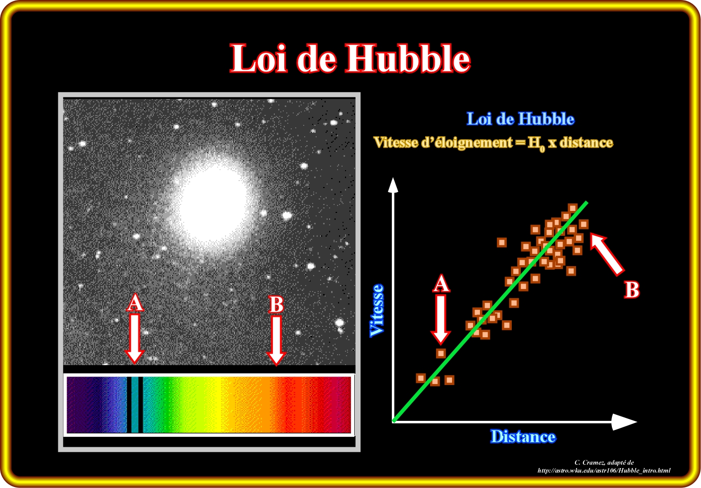 Comme l'illustre dans cette figure, les galaxies s'éloignent de nous et les unes des autres à rythme toujours croissant. Plus loin est une galaxie, plus vite il s'éloigne de nous. Cela signifie que l'univers est en expansion, comme quand on souffle dans un ballon. La loi de Hubble dit que la vitesse des galaxies, par rapport à leurs distances, est constante. Cette constante est connue comme la constante de Hubble, qui est le taux actuel d'expansion de l'univers, c'est-à-dire, environ 73 (km/s) / Mpc. Cela signifie qu'une galaxie située à 1 mégaparsec (environ 3,26 millions d’années-lumière) de l'observateur s'éloigne du fait de l'expansion de l'univers (et donc hors effet d'un mouvement propre de l'objet, négligeable à très grande distance) à une vitesse de 73 km / s). Autrement dit, le taux actuel d'expansion de l'univers est de 22 kilomètres par seconde par million d'années-lumière (unité de longueur, égale à un peu moins de 10 trillions km, ou 1016 mètres, 10 petameètres, tel que défini par l'Union Astronomique Internationale, une année-lumière est la distance parcourue par la lumière dans le vide en un an). Actuellement, les géoscientistes connaissent plus de 125 milliards de galaxies dans l'univers observable /chaque galaxie contient des milliards d'étoiles). Les diamètres des galaxies varient de quelques milliers à cent mille années-lumière. Mais nous ne pouvons connaître les galaxies qui sont dans un certain rayon, connu sous le rayon de Hubble. En fait, les galaxies plus grandes que le rayon de Hubble voyagent à la vitesse de la lumière. Le rayon de Hubble est estimé à environ 12 milliards (109) d'années-lumière. Le rayon de Hubble est souvent appelé simplement horizon, une fois qu’il est étroitement liée à l'horizon particule (distance maximale à qu’un particule pourrait avoir voyagé pour un observateur ayant l'âge de l'univers). Le rayon de Hubble est liée à la constante de Hubble H, puisque R = c / H, où c est la vitesse de la lumière, ce qui signifie, à peu près, le volume de l'univers. Comme l'univers est en expansion continue, sa densité d'énergie est continuellement décroissante (en l'absence de matière exotique, comme l'énergie fantôme).