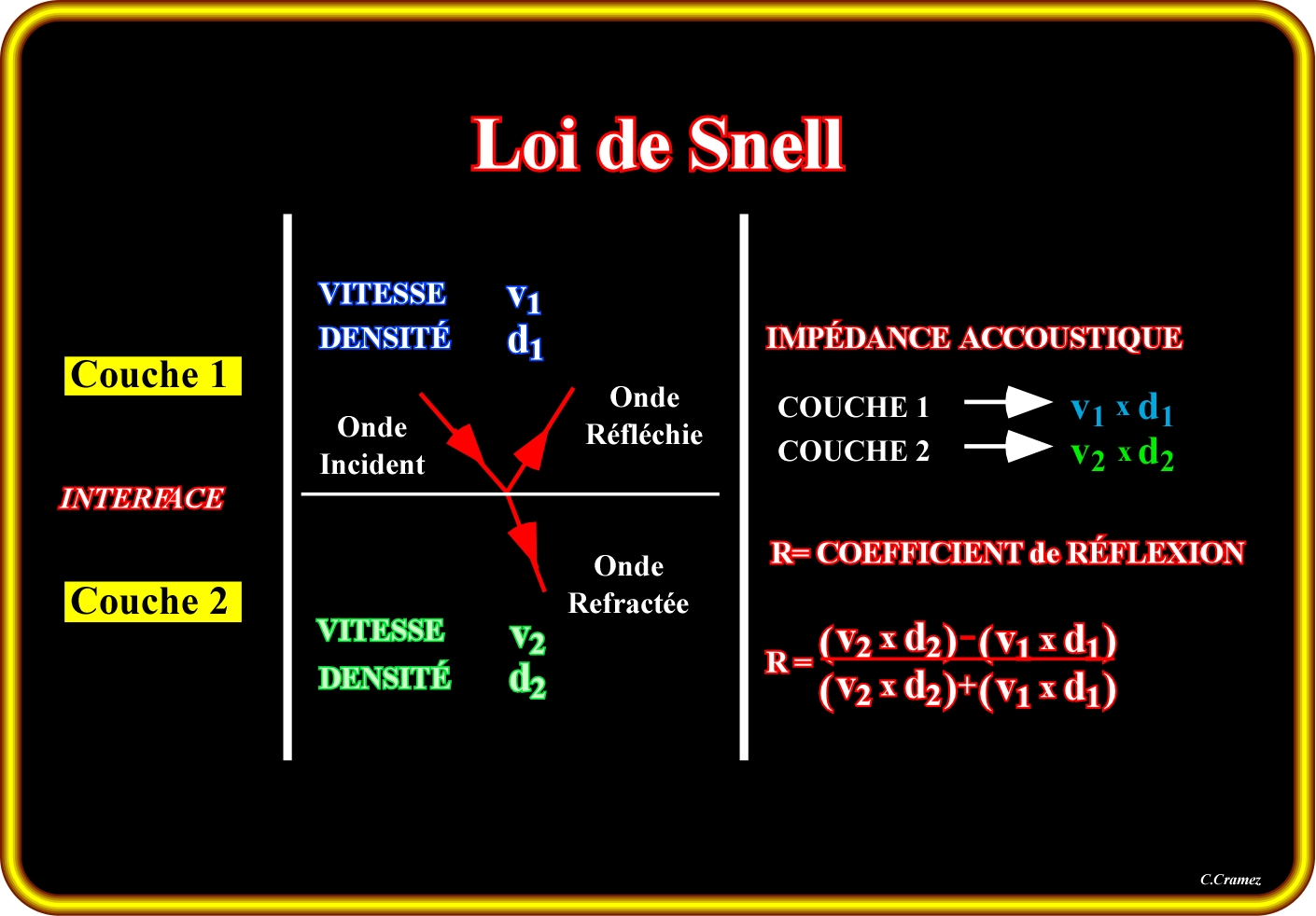 La réfraction se produit dans une l'interface entre deux matériaux en raison des différentes vitesses acoustiques qu’ils ont. La vitesse du son à travers chaque matériel est déterminée par les propriétés physiques du matériel, en particulier, les modules d'élasticité et densité. Lorsqu'une onde rencontre une interface entre deux matériaux avec des vitesses acoustiques différentes et la vitesse du matériel inférieur est plus grande, la portion de l’onde dans le matériel inférieur se déplace plus rapidement, et c’est à cause de cela que l’onde se dévie. La loi de Snell est, aussi, connue comme la loi de Descartes, car elle décrit la relation entre les angles et les vitesses des ondes. Ainsi, si la vitesse acoustique horizontale dans le matériel supérieur est v_1 et dans l’inférieur, v_2 et si l'angle d'incidence est α_1 et celui de réfraction, α_2, comme illustré ci-dessus, la loi de Snell-Descartes stipule que (sin α_1/v_1) = (sin α_2 /v_2). Cela signifie que la loi de Snell suit le principe du temps minimal de Fermat. En d'autres termes, une onde suit toujours le chemin le plus rapide, qui n'est pas, forcément, le plus court. Dans le diagramme illustré sur cette figure, il y a, également, une onde réfléchie longitudinale, qui est l'onde que se réfléchie avec le même angle que l’angle l'incident, puisque les deux voyagent dans le même matériel, c'est-à-dire, avec la même vitesse. Ainsi, en supposant que l'interface illustrée ci-dessus correspond à une interface entre deux intervalles sédimentaires avec des densités d_1 et d_2 et dans lesquelles les ondes sonores se propagent à des vitesses différentes v_1 et v_2, ce qui signifie que les intervalles ont des impédances acoustiques (v_1.d_1) et (v_2.d_2), le coefficient de réflexion, qui est le grand responsable des réflexions observées sur les lignes sismiques, est donné par le rapport entre la différence et la somme des impédances. Comme les ondes incidentes obliques à une interface, sont brisées en ondes réfléchies et réfractées, ce qui permet d'analyser une succession de interfaces superposées.