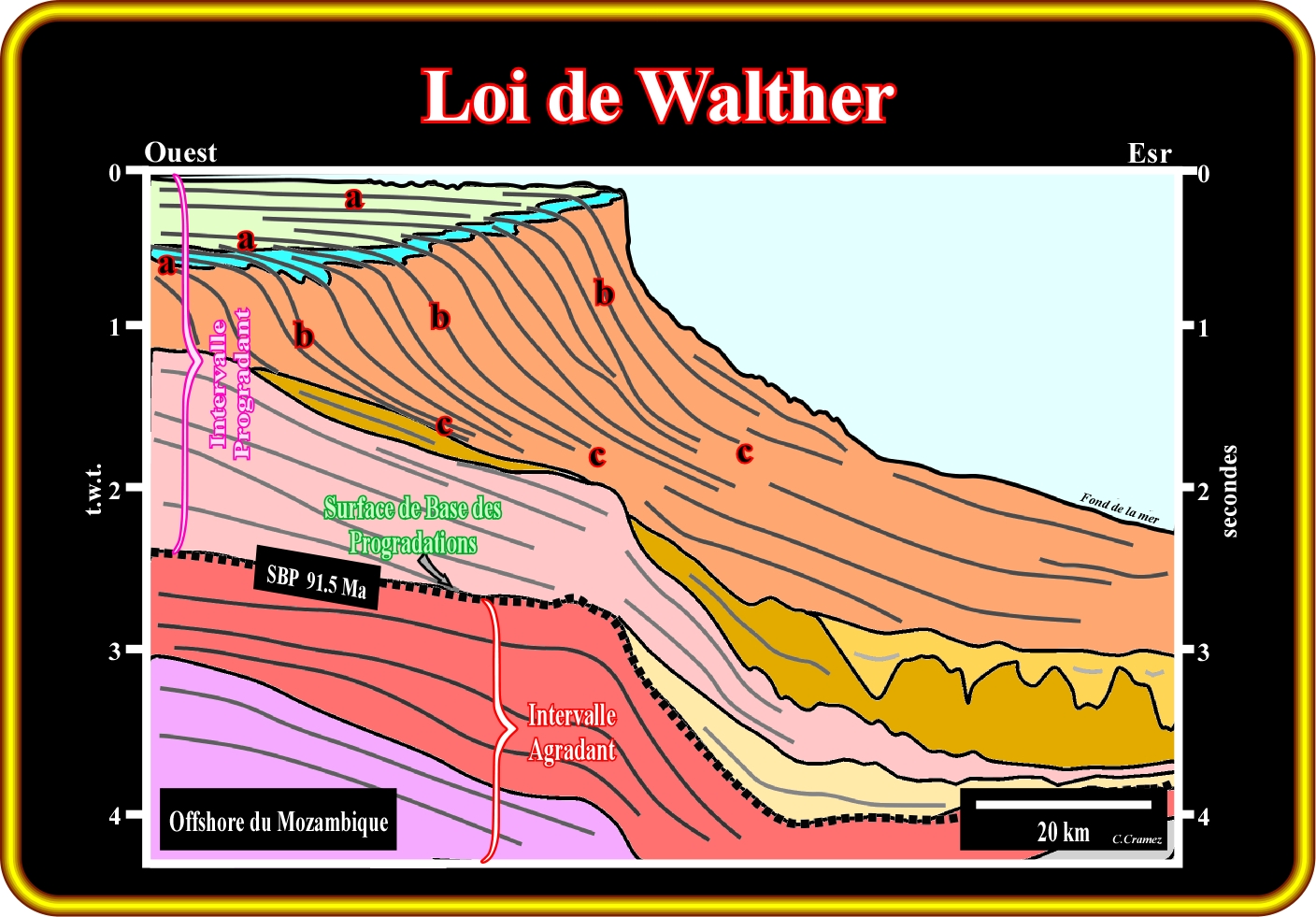 C’a été le géologue allemand Walther qui a étudié les relations entre les faciès (lithologie et la faune associée) et des environnements sédimentaires. Il a reconnu que les environnements de dépôt changent latéralement avec le temps, et par conséquent, les faciès des environnements de dépôt adjacente se succèdent les une aux autres comme une succession verticale. Ainsi, il a constaté que la succession verticale des faciès est la même que la succession latérale. Comme l'illustre cette tentative d'interprétation d'une ligne sismique de l’offshore du Mozambique, la succession latérale des faciès a-b-c se trouve, aussi, verticalement de bas vers le haut (c-b-a). Toutefois, cette loi (loi de Walther) n'est valide qu’en continuité de sédimentation, autrement dit, en des sections stratigraphiques sans discordances (surfaces d'érosion induites par des chutes relatives du niveau de la mer), et particulièrement dans l’absence de discordances renforcées par la tectonique (discordances angulaires). En outre, elle ne peut pas être appliquée que dans les sections qui ne sont pas subdivisées para des surfaces diachroniques, comme par exemple, les surfaces transgressives. Pourtant, paradoxalement, bien que les ensembles de paracycles séquence et cycles séquence soit subdivisés par des surfaces diachroniques, la loi de Walther est utilisée pour interpréter le contexte de dépôt de ces intervalles sédimentaires. La nature diachronique des surfaces qui limitent ces cycles stratigraphiques, pour des raisons pratiques, est ignorée et les paquets sédimentaires, qui les constituent (paracycles du cycle-séquence, ensembles de paracycles et cycles-séquence), sont considérés comme, plus ou moins, contemporains. En d'autres termes, les sédiments sous-jacents et sus-jacents aux surfaces que limitent chacune de ces unités stratigraphiques, sont plus jeunes ou au contraire, plus anciens que l’unité en question. Cela signifie que les sédiments, qui forment une unité sédimentaire, qu’elle soit un paracycle séquence ou un cycle séquence, sont supposés synchrones. Sur les lignes sismiques, en tenant compte la résolution sismique, l'erreur est minimale.