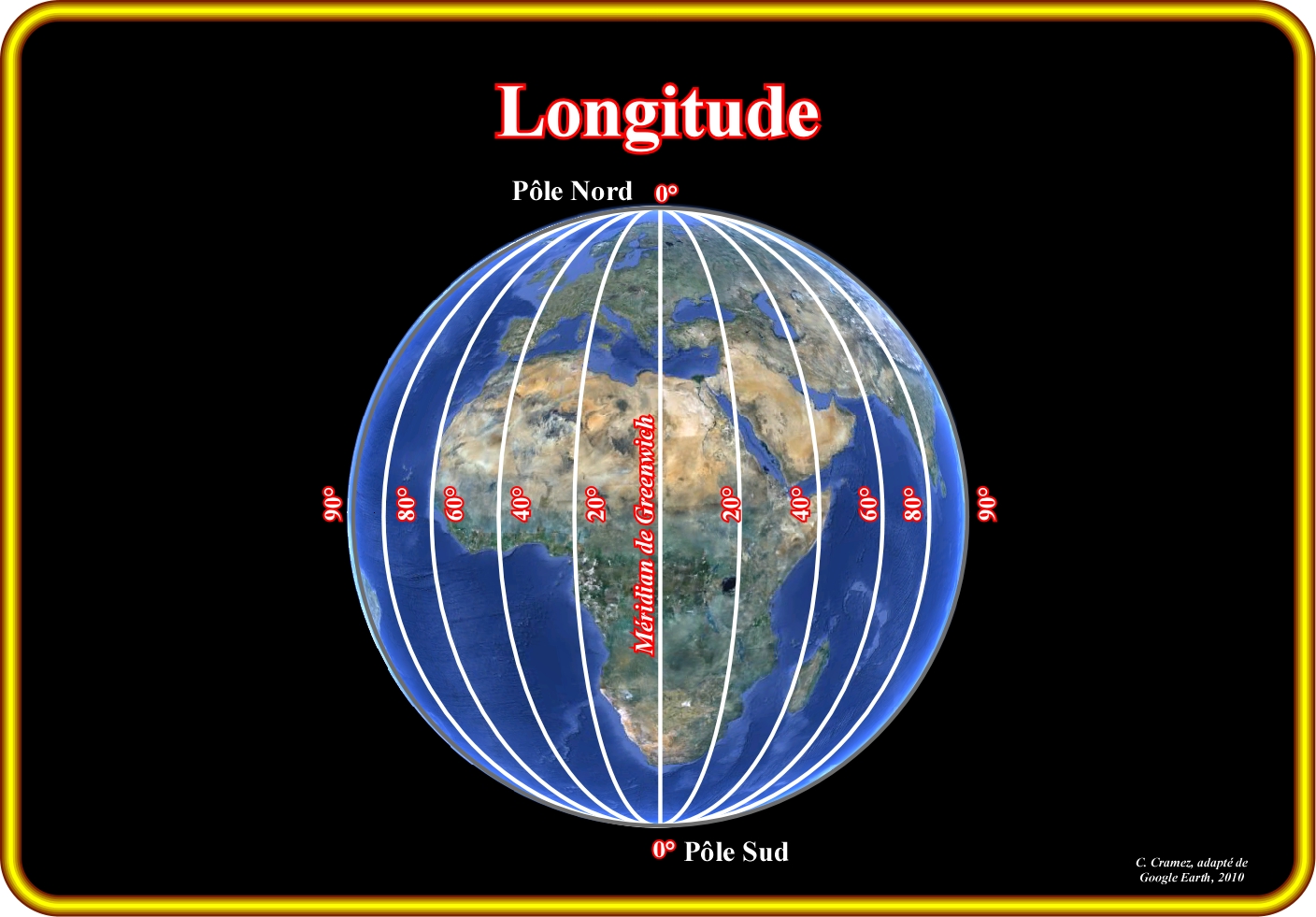 Distance angulaire, en degrés, minutes et secondes, d'un point à l'Est ou à l'Ouest du méridien de Greenwich. Les lignes de longitude sont, souvent, appelés méridiens.
