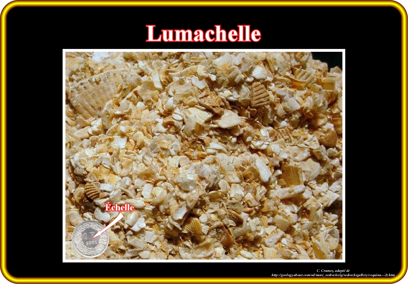 Comme illustré dans cette photo, une lumachelle, parfois appelée, aussi, ‘coquine’ (terme espagnol qui signifie coquillage) ou calcarenite, est une roche endogène constituée par des sédiments deutogènes, principalement des fragments de coquillages. Comme les coquillages sont formés de carbonaté de calcium, les lumachelles peuvent être considérées comme des calcaires endogènes (formés par des détritus), mais non comme des protogènes (formés par précipitation de carbonate de calcium) . Les lumachelles se forment près de la ligne de côte, où l’action des vagues est forte et capable de trier les sédiments, comme le suggère les particules brisées, mais polies (par l’abrasion des vagues de la mer), qui les constituent. Beaucoup de roches calcaires contiennent des fossiles, mas les lumachelles sont exclusivement constituées par des fossiles, comme on peut le constater dans la lumachelle illustrée dans cette figure. Une lumachelle très cimentée est, très souvent, désignée comme coquinite, ainsi comme un calcaire composé, principalement, par des fossiles de coquillages, qui vivaient où se sont déposées (dépôt in situ ou dépôt sur place), est appelé, parfois, calcaire à coquilles). Certains géoscientistes vont plus loin et différencient les lumachelles et calcaires à coquilles allochtones (formés par fragments qui n’ont pas été transportés) des lumachelles et calcaires à coquilles autochtones (formés par des fragments qui ont été transportés d’autres endroits). Beaucoup de lumachelles se forment à partir de matériel récifal et sub-récifal. Ces faciès sont surtout représentés dans les environs des récifs et contiennent, très souvent, des algues vertes des genres Gymnocodium, Macroporella et Mizzia, fusillines et gastéropodes. Les lumachelles ont été utilisées comme matériel de construction (dalles, pavées, etc.), une fois qu’étant peu cimenté elles se cassent facilement dans ses composants (fragments de coquilles et corail) et peuvent, ainsi, remplacer le gravier obtenu par fragmentation des roches, dont l’obtention est beaucoup plus chère. D’autre côté, comme les lumachelles contiennent, très souvent, des composants riches en phosphore, elles sont, en certains pays, utilisées comme des fertilisants.