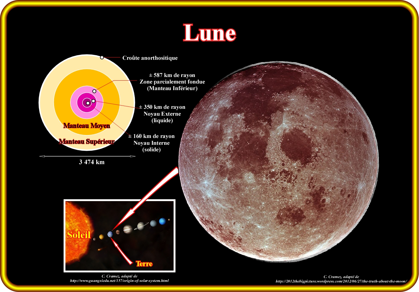 La distance moyenne entre la Terre et la Lune est d'environ 384 400 km. Le diamètre de la Lune est 3476 km, soit 27,3 % du diamètre de la Terre. La surface de la Lune est de 0.074 fois celle de la Terre. Le volume de la Lune est 0.20 fois celle de la Terre. La masse de la Lune est 0.1123 fois celle de la Terre et la force de gravité, à l'équateur, est 16.54% de la gravité terrestre sur équateur. La Lune tourne autour de la Terre en 27.3 jours. Elle est dans la même position dans le ciel tous les 29.5 jours. Il n'y a pas d'atmosphère sur la Lune. Ainsi, sur la Lune, même pendant la journée, le ciel est toujours noir. Aussi, sur la Lune, il n'y a pas de tremblements de terre ou des éruptions volcaniques, au moins depuis que la vie est apparue sur Terre. Vu de la Terre, la Lune, avec ses taches, montagnes et cratères est exactement la même depuis les premiers organismes vivants sont apparus sur la surface terrestre. De la Terre, on observe toujours la même face de la Lune (les premières images de la face cachée de la Terre ont été faites par une sonde en 1959). L'effet le plus frappant de la gravité de la Lune sur la Terre se manifeste par les marées. En fait, les mers de notre planète quand elles sont en face de la Lune sont fortement attirées par elle, en raison de sa proximité, ce qui provoque une hausse du niveau des mers que ce côté. De même, les mers, qui sont de l'autre côté de la Lune, sont moins attirées par elle, car elles sont plus éloignées, ce qui crée une chute du niveau de la mer. Bien que la force de gravité du Soleil soit plus fort que celle de la Lune, son effet sur les marées est d'environ 2/3, en raison de la grande distance que sépare le Soleil de la Terre. Quand la Lune est, plus ou moins, alignée avec la Terre et le Soleil, les marées provoquées par la Lune et le Soleil sont ajoutés, ce qui produit des marées beaucoup plus importantes (marées de vives eaux ou grandes marées qui se produisent naturellement deux fois par mois). De même, quand la Lune est décroissante ou croissante (quadratures), les marées sont des marées de mortes eaux avec des amplitudes minimales. Notons que la Lune est formée par une croûte anorthositique croûte, manteau et noyau dont la partie extérieure est liquide (en supposant que 10% a cristallisé).