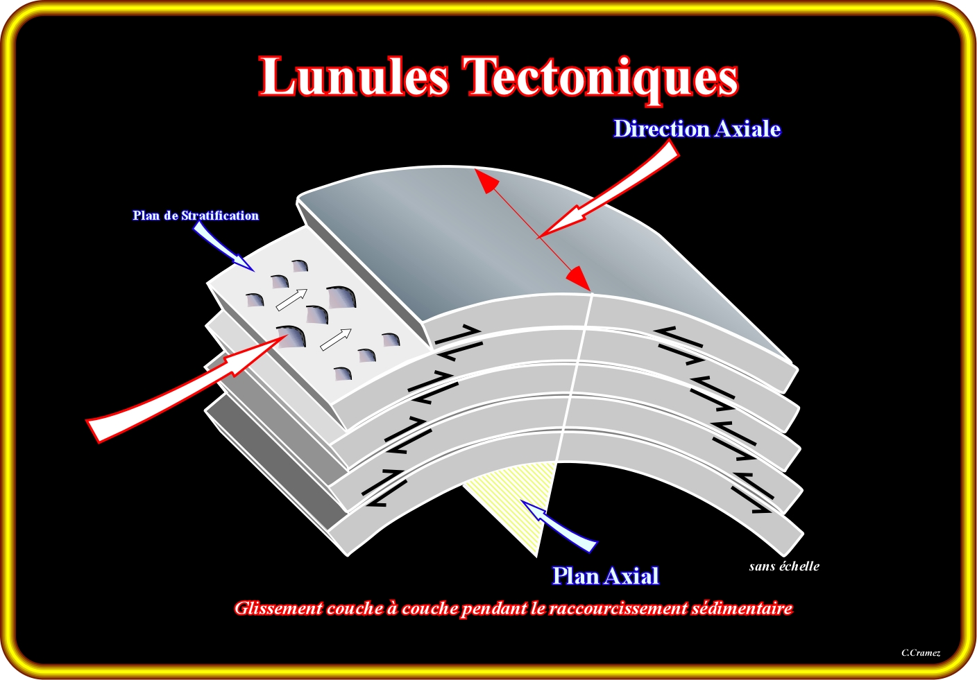 Les lunules tectoniques et l’importance des glissements couche à couche dans les plis jurassiques (chaîne des montagnes du Jura) ont été reconnus depuis de nombreuses années par les géologues suisses (Wegmann, C.E., 1954). En fait, au cours d'un raccourcissement des sédiments est facile de voir que pliage par glissement couche à couche fonctionne, plus au moins, comme le pliage d'un annuaire téléphonique où les pages (couches sédimentaires) glissent les une sur les autres. Comme le montre ce schéma, c'est le mouvement relatif des couches vers le sommet des anticlinaux, le long des plans de stratification, qui est la cause des lunules tectonique. Ces structures sont très utiles dans la géologie de terrain, car elles indiquent, à peu près, la direction axiale et la localisation de l'anticlinal. Au début de recherche pétrolière, c'est-à-dire avant la sismique réflexion, les lunules tectoniques ainsi que les plis d'entraînement (petits plis qui se forment sur les flancs des anticlinaux et dont la vergence indique la position de l'apex de la structure), étaient indispensables pour déterminer où puits d’exploration devraient être forés. En effet, à ce moment de l'histoire de la recherche pétrolière, presque tous les géoscientistes, sinon la totalité, utilisée la méthode de l’anticlinal pour localiser des pièges structuraux, autrement dit, les anticlinaux (la recherche pétrolière était limitée aux onshores). En d'autres termes, les géoscientistes cherchaient à trouver les structures anticlinales (ne pas confondre un anticlinal avec un antiforme, qui, au contraire de l’anticlinal, est une structure d’allongement et non de raccourcissement) pour localiser les puits d’exploration, une fois qu’un puits perfore dans ce type de piège (piège structural) traversera toutes les roches-réservoir potentielles dans des conditions optimales de piégeage). Quand un géoscientiste trouve dans un affleurement (plans de stratification) des lunules tectoniques il peut déduire la direction axiale et en quel sens se trouve l’axe de l’anticlinal, car la direction des lunules tectoniques est perpendiculaire à la direction axiale et le sens (inclinaison de la base des lunules, comme dans les lunules glaciaires) donne le sens du mouvement. Le même se passe avec les plis d'entraînement, dans lesquels la vergence est toujours en direction du plan axial.