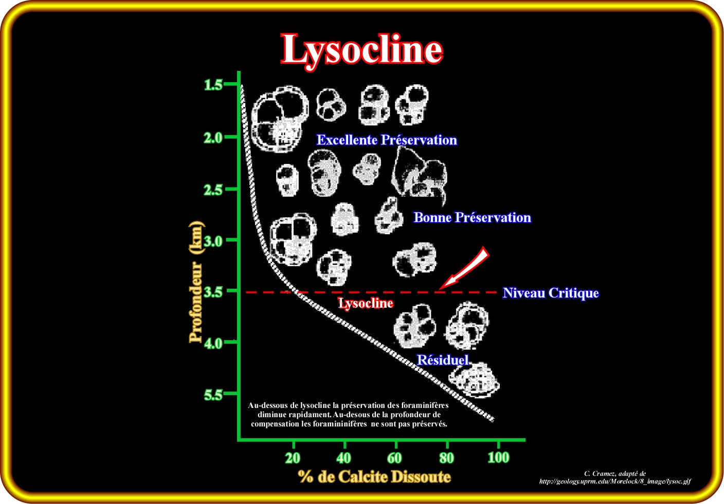 Profondeur de l'océan en dessous de laquelle le taux de dissolution de la calcite augmente de manière significative. Sous lysocline il y a une profondeur connue comme la profondeur de compensation des carbonates (PCC), sous laquelle le taux d'apport de la calcite balance le taux dissolution, ce qui signifie qu'il n'y a pas de dépôt de calcite.