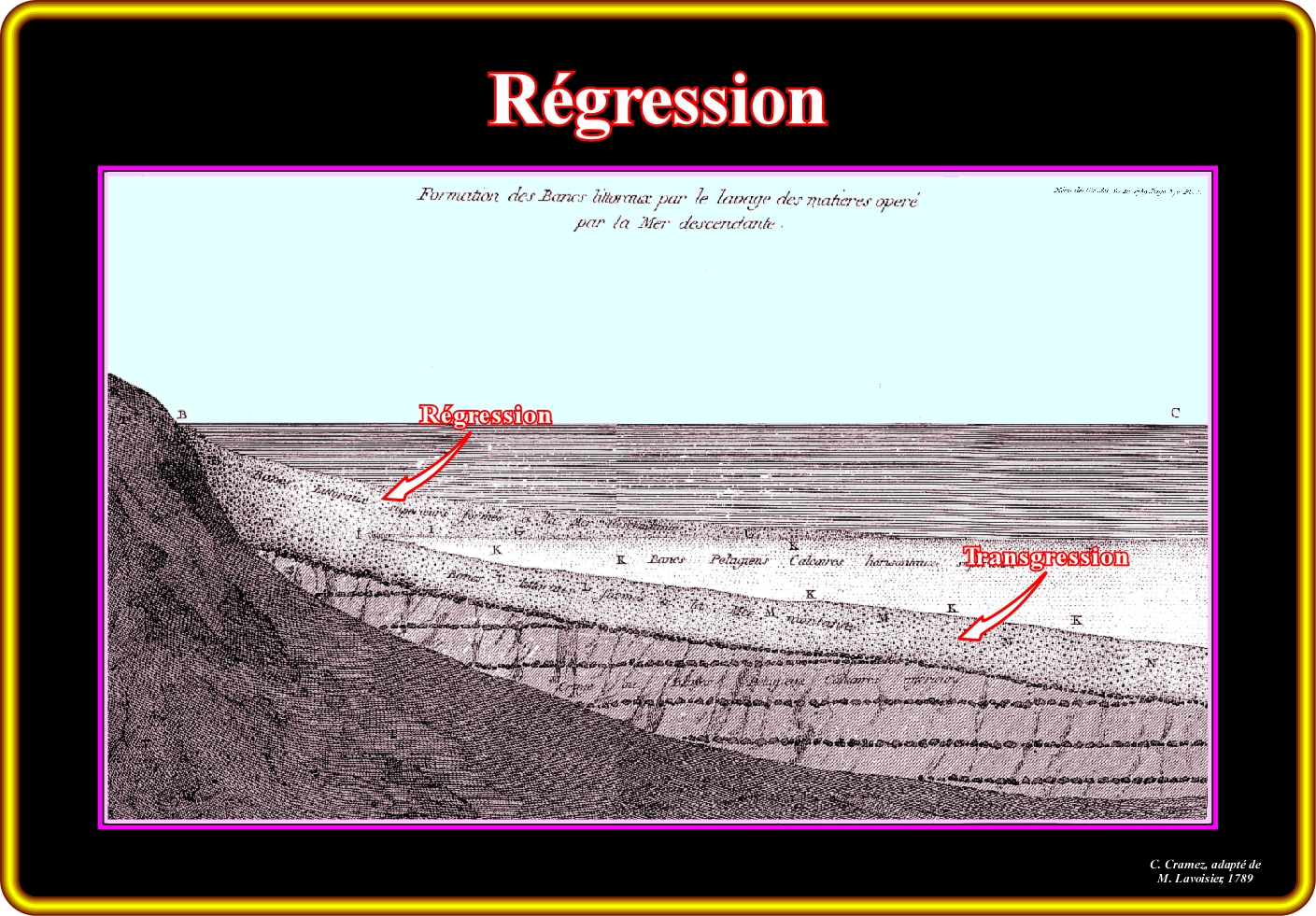 Lavoisier a été l'un des premiers scientifiques à comprendre le mécanisme des transgressions et régressions. Dans le bassin sédimentaire de Paris, qui en réalité n'est pas un bassin sédimentaire, mais plutôt une plate-forme déformée, Lavoisier a lié les déplacements de la ligne de côte et des dépôts côtiers associés avec les variations relatives du niveau de la mer. Il a interprété le déplacement vers la mer des dépôts côtiers (régression) comme la conséquence d'une chute du niveau de la mer (ce qui n'est pas toujours vrai) et le déplacement vers montant (régression) comme la conséquence d'une montée du niveau de la mer. Aujourd'hui, il est bien connu qu'épisode régressif ( à l'intérieur d'un cycle-séquence, par exemple) est associée à une montée relative du niveau de la mer en décélération, tandis qu'un épisode transgressif est associée à une montée relative du niveau de la mer en accélération. En effet, pour avoir déposition dépôt (cônes sous-marins exclus) il doit y avoir une augmentation de l'accommodation (espace disponible pour les sédiments). Dans la courbe cyclique de s variations relatives du niveau de la mer, laquelle est construite par l'action conjointe de la tectonique (subsidence ou soulèvement) et de l'eustasie, une transgression (déplacement vers le continent de la ligne de côte et des dépôts côtiers) se distingue d'une régression car dans le premier cas, la vitesse de montée de niveau relatif de la mer augmente alors qu'elle diminue dans la régression. Cependant, il est nécessaire de tenir en ligne de compte l'apport terrigène. Si l'apport terrigène est faible, la ligne de côte et les dépôts côtiers se déplacent vers le continent (transgression), quel que soit le taux de montée du niveau relatif de la mer (voire nul, cela signifie que le niveau relatif de la mer est stable). Inversement, si l'apporte sédimentaire est trop grand, les dépôts littoraux et la ligne de côte se déplaceront vers la mer (régression) quelle que soit la variation relative du niveau de la mer (même durant une montée relative). Dans l'embouchure d'un fleuve, quand il se forme un delta, il y a côte à côte, une régression (delta) et une transgression (douves latérales ou des fosses). Si l'apport sédimentaire équilibre les montées relatives du niveau de la mer, la ligne de côte et les dépôts côtiers ne progradent pas, mais ne rétrogradent non plus. La ligne de côte reste au même endroit qui est aggradé verticalement.