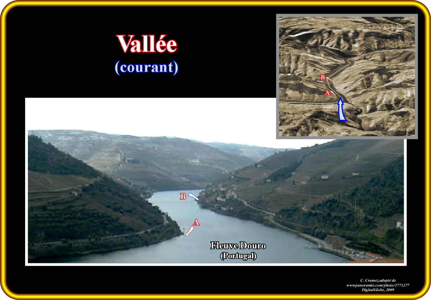La vallée du Douro, au Portugal, est connue partout dans le monde, non seulement pour sa terrasse (construit en grande partie par les Romains, comme ils l'ont fait aussi dans la vallée du Rhône, et, en particulier, en Valais, Suisse), mais et surtout parce c’est sur eux qui poussent les raisins à partir desquelles on fait le vin du Porto. Il ne faut pas confondre la vallée d’un fleuve (ou rivière) avec le lit du cours d’eau. La vallée correspond aux talus que les populations utilisent pour l'agriculture. Le lit d'un cours d’eau est l'espace qui peut être occupée par les eaux d'un courant. Cependant, comme cette définition est très vague et il est intéressant de ne pas oublier qu'un fleuve, comme n'importe quel autre cours d'eau, peut avoir au moins trois lits : (i) Lit majeur ou lit d’inondation, qui englobe toute la zone que le cours d’eau inonde et qui, en général, est recouverte d'alluvions modernes, comme illustré dans les cartes géologiques et qui est beaucoup plus large que le lit ordinaire ; (ii) Lit ordinaire régulier ou mieux lit apparent, qui est l’ alvéoles, bien déterminé entre entre les marges, occupé par du matériel roulé pare l’eau et peu masqué, contrairement au lit majeur, qui est en grande partie recouvert par la végétation et occupé par l'homme et (iii) Lit réduit, qui est le lit qui pendant l’été, occupe une petite partie du lit ordinaire et qui n’est pas limité par des marges nettes. En réalité le lit réduit erre dans les limites du lit ordinaire et, éventuellement, peut se diviser en plusieurs branches. Après les inondations, les lits majeurs sont occupés par du matériel sédimentaire fin (sauf en montagne), une fois que les versants, qui, en général, sont cultivées, fournissent exclusivement du matériel à granulométrie fine. Ces matériaux sont ce que les géoscientistes appellent dépôts de débordement. La largeur des lits ordinaires ou apparents est fonction de la résistance des roches encaissantes, de l’écoulement du courant et du frottement des matériaux transportés. À écoulement égale, la largeur du lit apparent est maximale pour les cours d’eau chargés de sable, sable grossier, gravier, cailloux, et lorsque le courant est formée des chenaux en tresse entre les bancs sédimentaires. Le matériel qui forme le lit d'un cours d'eau peut être formé par les roches in situ ou par du matériel transporté par le courant. Cependant, il est abusif d'associer le lit alluvial d'un cours d’eau à un remplissage et un lit rocheux à une érosion.