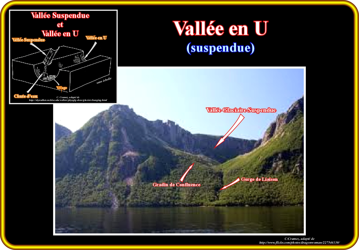 Comme l'illustre cette figure, une vallée suspendue est une vallée typique du paysage glaciaire (où s'écoule ou s'est écoulé, dans le passé, un glacier), où un affluent de la vallée glaciaire principale s'écoulait (il y a une dénivelée important entre les deux vallées, qui est, souvent, soulignée par une chute d'eau ou une cascade. Ainsi, la vallée glaciaire principale est toujours beaucoup plus incisée par l'action du glacier principal que les vallées suspendues tributaires. Tous les vallées glaciaires ont une section transversale en forme de U. D'autre part, une vallée glaciaire est, partiellement, remplie par des systèmes de dépôt glaciaires, comme, par exemple, les moraines, tilles. Ses parois ainsi que le lit sont lisses et ont des stries qui ont été faites par les roches que le glacier transportait. Sur ce sujet, les roches moutonnées (roches sur lesquelles une masse de glace à séchée qui présentent une géométrie similaire à celle du dos d'un mouton) sont particulièrement intéressantes une fois que sa forme indique la direction et sens du mouvement de la glace. N'oublions pas qu'un glacier est, avant tout, un courant de glace, de sorte qu'il n'existe que quand le glacier s'écoule, autrement dit, quand l'accumulation compense pour l'ablation. Toutefois, lorsque l'ablation est plus grand que l'accumulation, un glacier ne se rétrécit (il n'y a pas mouvement en arrière), mais il continue à couler vers le bas en se amincissant. Il est important de ne pas oublier que quand on parle d'amincissement ou épaississement d'un glacier, ce qui est très à la mode actuellement, puisque beaucoup de personnes et surtout des hommes politiques commencent à réaliser que les changements climatiques ont toujours existé dans l'histoire géologique. Au point de vue de la stratigraphie séquentielle, la présence de vallées suspendues dans une région donnée, suggère que l'a montée relative du niveau de la mer ((glacio-eustasie) se fait en différents phases.