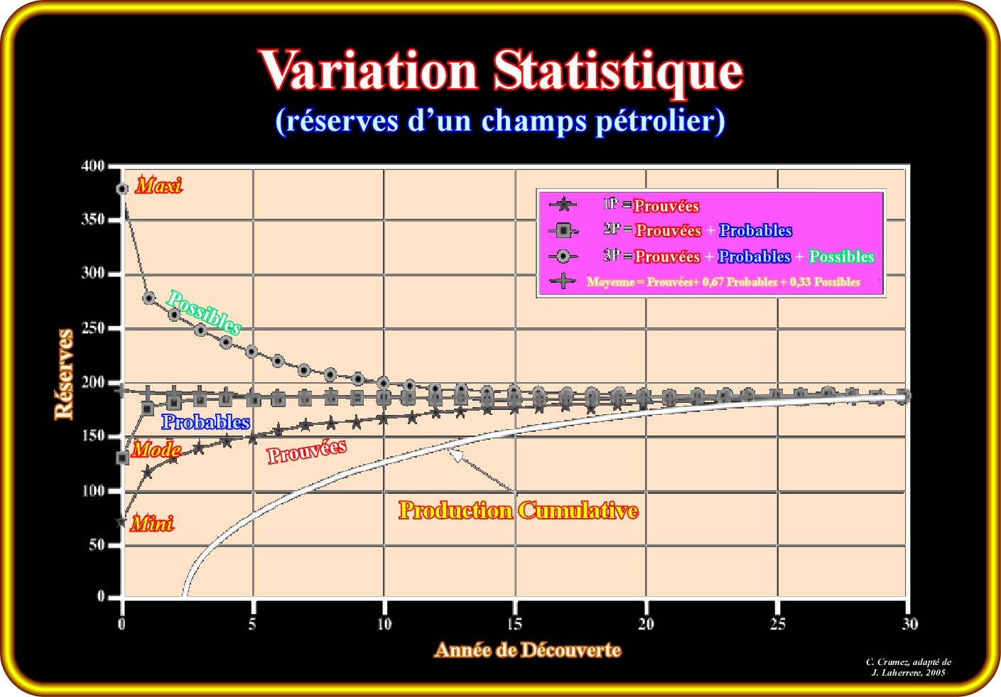 Le coefficient de variation est, parfois, multiplié par 100, c'est-à-dire, exprimé en pourcentage. L'utilisation du coefficient de variation est recommandé pour des variables quantitatives du type raison (dans laquelle il y a un zéro absolu), tels que l'hauteur, poids et vitesse. Si la variable n'est pas du type raison, le coefficient de variation pourra avoir des valeurs négatives et son interprétation dépendra du point de référence (point considéré comme "0" dans l'échelle), ce qui conduit à des interprétations erronées et relatives. Exemple: considérons une distribution à valeur moyenne/moyen de 40 et un écart type de 4. Puis envisageons une autre distribution avec la valeur moyenne / moyenne égale à 5 et un écart-type égal de 4. On notera que l'écart type de la seconde distribution a un poids beaucoup plus importante que dans la première et, cependant, l'écart-type est le mêmes dans les deux cas. En déterminant le coefficient de variation il est possible de savoir de que manière l'écart type est pour la moyenne / valeur moyen. Dans ces exemples, le coefficient de variation est respectivement de 4/40 = 0.1 et 4/5 = 0.8 . Dans l'interprétation de ces chiffres, on peut dire que dans la première distribution, en moyenne, les écarts par rapport à la moyenne atteindre 10% de cette valeur de celle-ci. Dans la deuxième distribution, cependant, écarts par rapport à la moyenne atteignent environ 80% de celle-ci. Les pourcentages montrent le poids de l'écart-type de la distribution. Comme l'illustre cette figure, lors de la production d'un champ de pétrole, la variation des réserves d'hydrocarbures, autrement dit, l'incertitude des réserves varie avec le temps. Au début de la production les valeurs maxi, mode et mini sont très différents. Toutefois, au fur et à mesure que les hydrocarbures sont produits, le maxi, mode et mini s'approchent les uns des autres jusqu'à une valeur particulière, qui correspond aux total des hydrocarbures produites jusqu'à ce que le champ soit considéré comme dépleté.