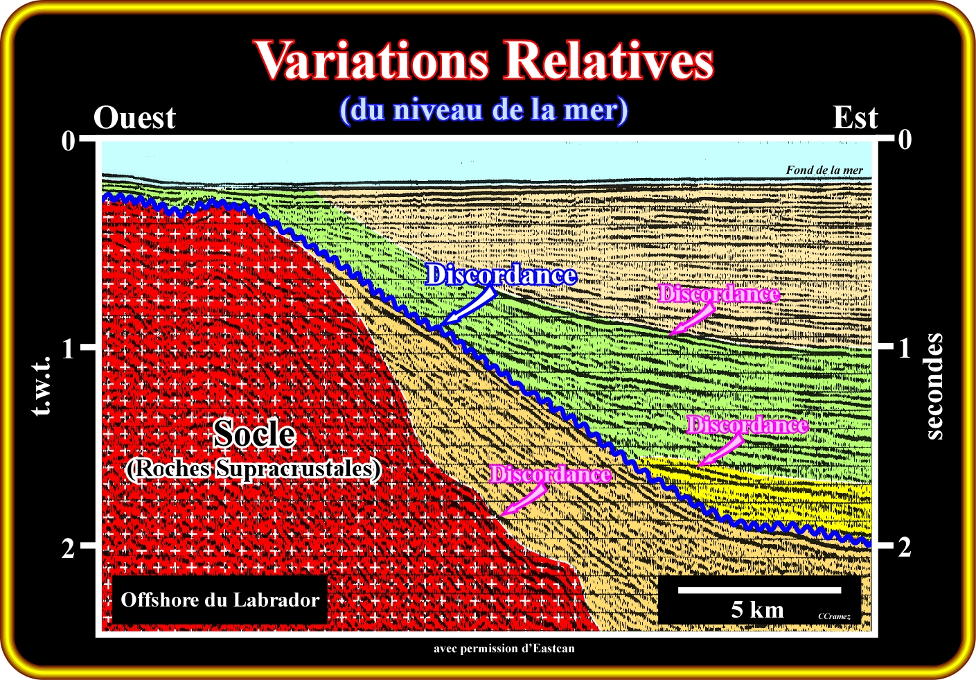 Bien que les fluctuations globales du niveau de la mer résultant de l'épaississement ou de l'amincissement (partielle ou totale) des glaciers et calottes glaciaires, ainsi que des variations du volume des bassins océaniques (configuration marges continentales et planchers océaniques), il y a, aussi, un certain nombre de processus géologiques régionaux qui peut changer les positions de niveau relatif de la mer, ce qui affecte la position du rivage dans une région déterminée. Parmi ces processus régionaux, on peut citer : (i) Expansion thermique de l'eau de s océans ; (ii) Variations de charge d'eau de fonte ; (iii) Réajustement isostatique ; (iv) Soulèvement ou subsidence des zones côtières par différents processus tectoniques ; (v) Subsidence compensatoire (c'est-à-dire, écoulement latéral des intervalles stratigraphiques mobiles ; (vi) Charge sédimentaire ; (vii) Compaction, etc. Les variations relatives du niveau de la mer peuvent également résulter de variations géodésiques comme, par exemple, les fluctuations de la vitesse angulaire de la Terre ou de la traction polaire (phénomène géologique causée par les variations du flux de la partie liquide du noyau de la Terre, ce qui change l'orientation du champ magnétique de la Terre et donc la position du pôle Nord magnétique). Il est intéressant de noter, que les registres des marées suggèrent une montée globale moyenne du niveau de la mer au cours du siècle dernier, entre 0-3 mm par an, bien qu'il n'y ait pas dune évidence irréfutable de ces valeurs. Cependant, certains alarmistes, comme l'Agence de l'Environnement des Etats-Unis, prédisent une montée globale du niveau des mers d'environ 15 m jusqu'à 2050 (environ 3 mm par an) induite par le réchauffement climatique anthropique (s'il existe). En réalité, les variations globales et relatives du niveau de la mer existent pratiquement depuis la formation Terre, une fois que sans augmentation de l'accommodation (espace disponible pour les sédiments), la sédimentation dans la Terre serait impossible. Dans cette tentative d'interprétation géologique d'une ligne sismique tirée au large du Labrador (Canada), les terminaisons des réflecteurs, qui définissent les surfaces sismiques, comme les discordances (déterminées par biseaux d'aggradation) permettent la reconstitution des variations relatives et globales du niveau de la mer qui ont le dépôt induit le dépôt de la colonne sédimentaire (voir - Cycle de haute fréquence).