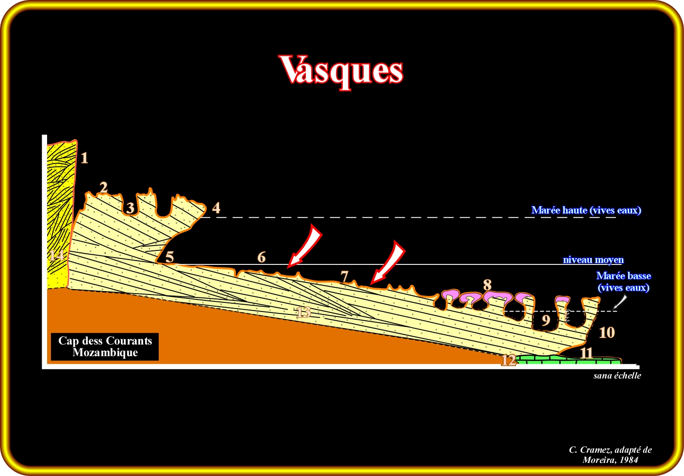 Cette coupe géologique de la Pointe de Jangamo (Cap des Courants au Mozambique) illustre le zonage et les principaux types de microformes du Karst littoral, en éolianites, c'est-à-dire, dans des roches formées de sable, parfois calcaires, empilés par le vent (dunes) et des grès de plage : (1) Falaise morte alvéolée, la quelle a des alvéoles de corrosion ; (2) Plate-forme avec des lapiaz (formation géologique résultant du ruissellement dans les roches de type calcaire en forme de ciselures d'une profondeur pouvant atteindre plusieurs mètres) pointues ; (3) Mares littorales ; (4) Viseur de falaise vivante ; (5) Encoche ; (6) Plate-forme avec vasques et mares embryonnaires ; (7) Vasques de plate-forme incrustées d'algues calcaires ; (8) Plate-forme bioconstruite par tubicoles ; (9) Mares côtières; (10) Corniche de déferlement ; (11) Encoche submergé ; (12) Banc de corail mort ; (13) Grès de plage et (14) Éolianites. Les vasques ou plate-formes de dissolution sont, également, très fréquents dans les régions où la ligne de côte est composée de récifs et sables calcaires, comme, par exemple, dans les îles hawaiiennes. Une description détaillée des caractéristiques et formation des vasques dans ces îles cet été donné par Wentworth (1939), où le profil de la côte est très similaire à celui illustré dans cette figure : (i) En général, elles ont plusieurs centaines de mètres de long (parallèlement à la ligne de côte) et une largeur comprise entre 1.5 et 20 mètres ; (ii) Elles sont très lisses ; (iii) Leur surface normalement à des variations d'altitude qui ne dépassant pas 7-15 cm, sur une surface de 15 x par 30 mètres ; (iv) Le bord extérieur s'élève, plus ou moins, abruptement de l'eau ; (v) La surface est, généralement, de quelques centimètres ou un mètre au dessus du niveau de la mer et il n'y a aucun seuil du coté de la mer ; (vi) Les vasques proprement dites sont formées par calcaires récifaux, qui contribuent à la construction des vasques en direction de la mer ; (vii) Ces vasques, surtout dans la partie interne, près de la côte, sont formés par la dissolution du calcaire des mares littorales par l'eau de la pluie.