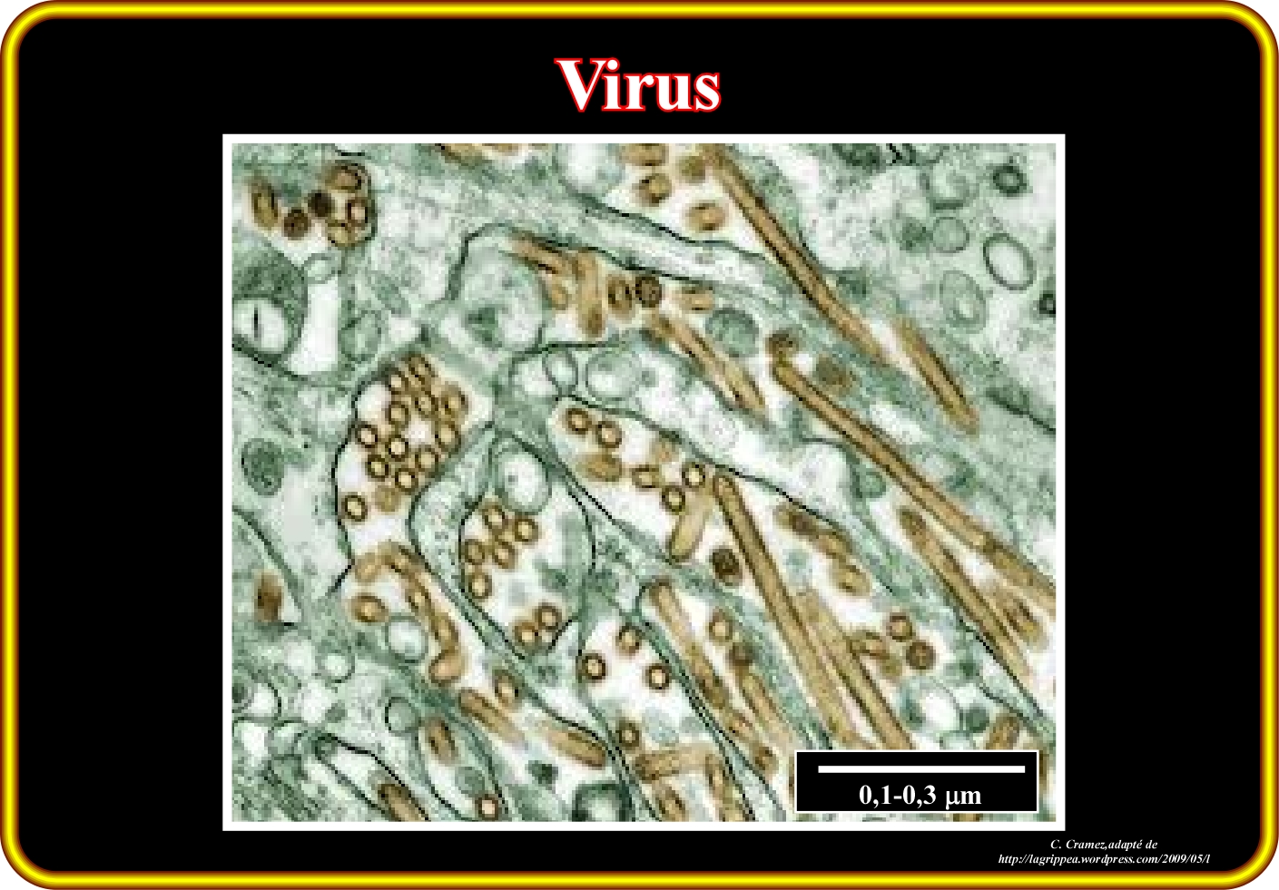 Organismes ou cellules non vivantes. Ce sont des particules d’environ 0.1-0.3 micromètres de diamètre, qui contiennent un simple ou double génome de l'ADN ou de l'ARN. Les virus peuvent se produire uniquement à l'intérieur des cellules vivantes, de bactéries, plantes ou animaux.