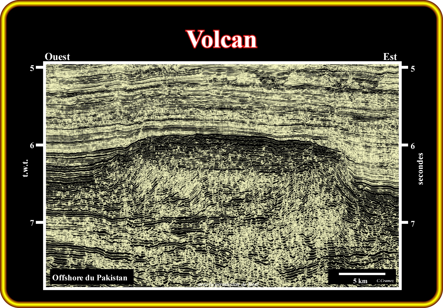 Comme illustré sur cette ligne sismique de l'offshore du Pakistan, lorsque le magma atteint la surface de la Terre, éventuellement, mais pas toujours, il entre en éruption et la lave (le terme donné au magma lorsqu'il atteint la surface) s'écoule dans des directions opposées formant une cône ou volcan. Ainsi, on peut dire, qu'une montagne volcanique, généralement, avec la forme d'un cône et un cratère au sommet, se forme autour d'une ouverture ou cheminée par l'accumulation de coulées de lave solidifiées et cendres (petits fragments de roche). De nombreux volcans se forment sur les bords des plaques lithosphériques, où le mouvement des plaques génère magma (marges convergentes) ou permet au matériel mantéllique de remonter à la surface (marges divergentes). Cependant, un grand nombre de volcans sont situés loin des bords des plaques lithosphériques, dans les points chauds, où la croûte terrestre est plus mince. Il existe deux principaux types de volcans: (i) Volcans composites ou stratifiés, qui sont très hauts, relativement étroit et construit par une multitude de coulées de lave qui s'amincissent au fur et à mesure qu'on s'éloigne du cratère et (ii) Volcans-boucliers, qui, contrairement aux premiers, sont bas, larges, plus ou moins arrondis, avec un sommet plat. Les derniers volcans sont beaucoup moins dangereux que les premiers, une fois les coulées de lave, en général, sont accompagnées de matériaux pyroclastiques. Les volcans composites émettent des débris pyroclastiques, tandis que les volcans boucliers produisent des coulées de lave. Le type d'activité volcanique dépend aussi de l'âge du volcan. Les premières phases de l'éruption sont généralement plus vigoureuses, une fois le magma tente d'atteindre la surface et par conséquent la pression est beaucoup plus grande. Dès que la pression diminue et se forme la cheminée la phase principale de l'activité volcanique. Quand la pression disparaît en raison de l'épuisement du magma, l'activité volcanique diminue de sorte qu'elle se limite à l'émission de gaz, qui, avec le temps, s'arrête également et le volcan entre dans une période de repos.