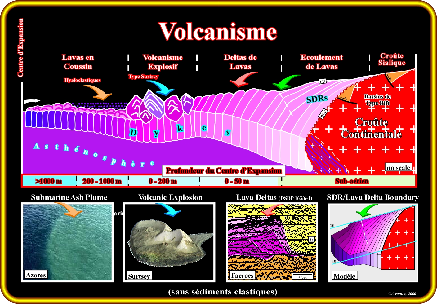 Sur la surface de la Terre, il y a plusieurs formes de volcanisme, cependant, la plus importante est lié à la formation des volcans. Toutefois, les volcans peuvent être de différents types et créés par différents processus géologiques. Jusqu'à il y a quelques années, la grande majorité des géoscientistes pensait que la cause principale du volcanisme était la subduction de la croûte terrestre. En réalité, les marges divergentes et particulièrement les marges Atlantiques ont été considérées comme des marges non-volcaniques. Cette conjecture a été complètement réfutée par les études des offshore profonds, notamment par l'interprétation géologique des lignes sismiques régionales, qui suggèrent des quantités massives de volcanisme subaérien. Plusieurs puits d'exploration pétrolière et DSDP (Deep Sea Drilling Project) ont corroboré la présence d'un volcanisme subaérien, qui a forcé les géoscientistes de changer radicalement le modèle d'ouverture des marges Atlantiques. Dans cette figure est montré que le modèle, qui compagnie pétrolière Total a proposé pour les marges divergentes type de l'Atlantique (Golfe du Mexique inclus), où, entre la croûte océanique classique (laves en coussins) et la croûte continentale, qui a une limite plus au moins abrupte (sans un amincissement excessif de la croûte continentale), il y a une croûte volcanique subaérien dans laquelle la morphologie des dépôts volcaniques varie en fonction de la profondeur des centres d'expansion (volcans) : (i) Écoulement de lave (profondeur de l'eau, environ 0) ; (ii) Deltas de lave (profondeur d'eau comprise entre 0 et 50 m) ; (iii) Volcanisme explosif (profondeur d'eau comprise entre 0 et 200 m) et (iv) Croûte océanique (laves en coussins), qui se forme dès que la profondeur de l'eau est supérieure à 200-300 mètres.