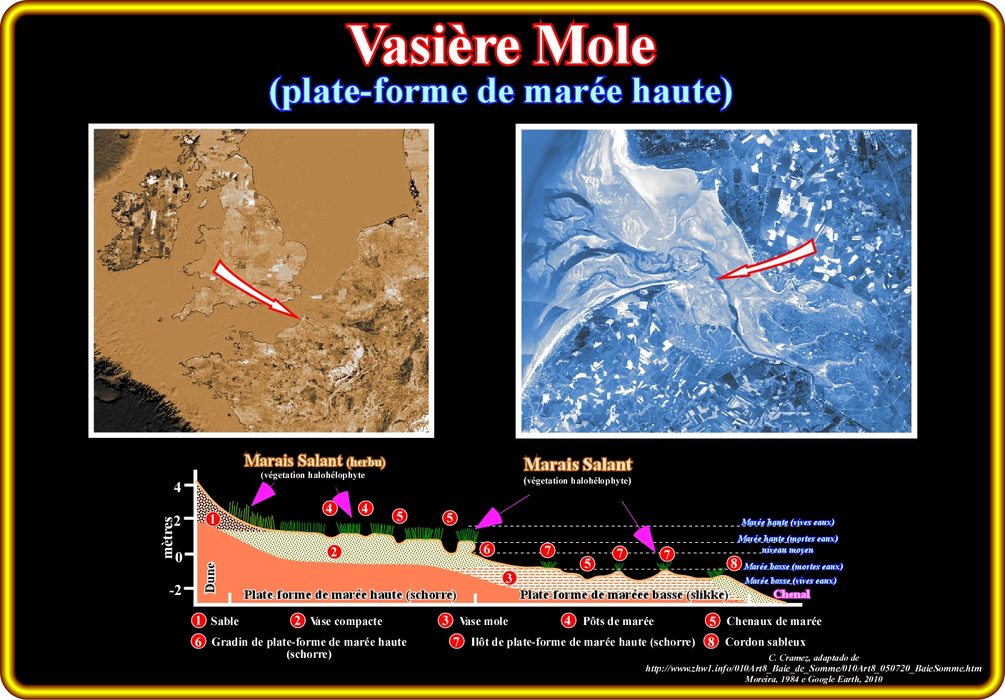 Les vasières compactes et moues de la plate-forme de haute-marée («Schore-Hiss" en anglais) correspondent à des empilements de sédiments marins et fluviaux fins, qui sont couverts par la mer à marée haute. La végétation pousse peu sur ce type de dépôt, mais la productivité biologique est très importante. L'abondance de micro-organismes, crabes, vers et mollusques attire des nombreux oiseaux, dont le célèbre l'huîtrier (facilement reconnaissables à leur silhouette noire, qui contraste avec la couleur orange du bec orange et dont l'appel aigu caractéristique s'ajoute au fort bruissement du déferlement des vagues sur les rochers où il vit), qui est accusé d'avoir joué un rôle actif dans l'épuisement des ressources. Notons dans la partie inférieure de ces vases, la présence de certaines algues et de Moliço (terme portugais qui désigne, indépendamment des espèces, des plantes qui constituent la végétation qui pousse immergé dans les eaux des marais et entre lesquelles on peut citer la Zostera marina ou bande» et la Zostera noltii, connue comme de «Sirgo», «Moss», «Seba» ou «cirgo"), qui favorise l'accumulation de sédiments. La partie supérieure de la vase compacte de haute-marée est colonisée par halophytes comme salicorne et la spartine, qui fixent la boue dans leurs racines. Les marais (formations alluviales périodiquement inondées par l'eau salée et occupées par une végétation halophyte ou, dans certains cas, par des manteaux de sel), qui se forment par une montée du niveau du sol, en raison des accumulations successives de sédiments, et qui sont couvertes pendant la marée haute, sont généralement séparés de la vase compacte par une micro-falaise (petite rupture de l'inclinaison du sol). Les marais, qui dans les régions tropicales sont connus par mangroves) fournissent un pâturage de qualité pour les troupeaux de moutons. Dans la photo illustrée dans cette figure, les marais sont couverts par de nombreux plans d'eau qui sont utilisés pour la chasse. Si l'envasement de la baie illustrée dans la photo (Baie de Somme, France) est un phénomène connu depuis de nombreuses années, son intensité accélère l'étendue des marais, qui étaient peu développées au début du XXe siècle, mais qui occupent désormais une superficie importante de l'estuaire et sa progression ne s'arrête pas d'augmenter.