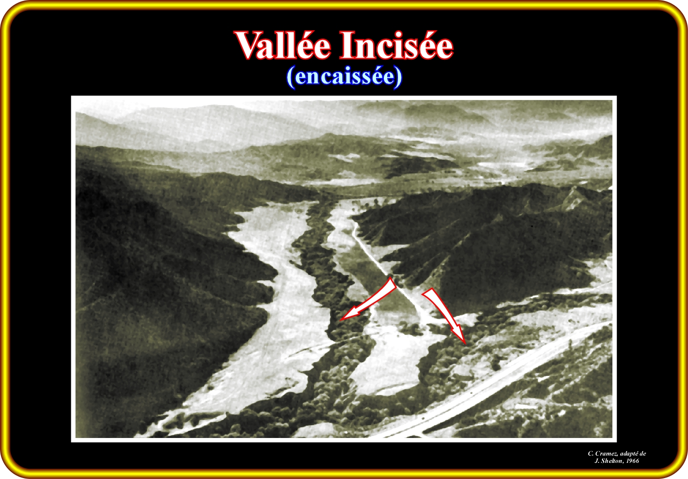 Dans cette photo, une partie de la vallée d'un courant (zone comprise entre le haut des talus de chaque côté du lit du cours d'eau) a été remplie d par des sédiments, probablement lors du dépôt de la dernière phase d'un prisme de bas niveau, quand le niveau de la mer était proche, mais toujours inférieur, au rebord du bassin. L'anomalie topographique induite par le courant est, ici, très évident. L'incision a été produite par une chute relative du niveau de la mer, dans laquelle le paramètre tectonique, probablement, a eu une importance similaire à celle de l'eustasie. En fait, une chute relative significative du niveau de la mer a mis le niveau de la mer plus bas que le rebord du bassin, ce qui détruit les profils d'équilibre provisoire des cours d'eau (quand le long du cours d'eau l'inclinaison permet uniquement l'évacuation de la charge), une fois que les embouchures des courants ont déplacés vers l'aval (parfois des dizaines, voire des centaines de kilomètres). Ainsi, les cours d'eau sont forcés de creuser leurs lits pour rétablir un nouveau profil d'équilibre provisoire. Plus tard, au cours de la montée relative suivante du niveau de la mer, les vallées incisées ont été était remplies par des sédiments formant ce que certains géoscientistes, en particulier ceux qui interprètent les lignes sismiques, appellent à tort, une vallée incisée. En analyse séquentielle, les remplissages des vallées incisées sont très utiles car ils permettent la localisation des discordances, surtout quand elles n'ont pas été renforcés par la tectonique, ce qui est le plus souvent le cas. Notons que le profil d'équilibre définitif ou idéal est une utopie géologique, car cela signifierait que tout le long du parcours, l'inclinaison du courant ne permettrait que l'écoulement de l'eau sans qu'aucun matériel serait transporté. La pente d'un tel profil, qui est donnée par la formule de Chevy-Eytelwein, est si faible que, pratiquement, elle ne peut jamais être atteinte. Ainsi, le seul profil qui nous intéresse est le profil d'équilibre provisoire, que la grande majorité des géoscientistes appellent simplement le profil d'équilibre.