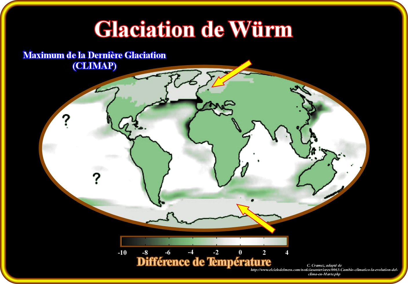 Cette carte représente l'étendue de la glace (en gris clair, flèche) au cours de la dernière période glaciaire, appelée glaciation le Würm ou Wisconsin, qui a eu lieu à il y a quelques 20.000 ans et qui a durée plusieurs milliers d'années. En effet, la glaciation Würmienne correspond, à peu près, aux phases 2, 3, 4 et 5a-d de la chronologie isotopique développée depuis les années 1950. Sa limite inférieure est, généralement, fixée à 115 .000 années du Christ (début de la phase 5d), mais certains géoscientistes considèrent qu'elle a commencé avec la phase 4 (environ 75 k AC). Sa limite supérieure correspond à la fin de la phase 2, au début de l'Holocène, c'est-à-dire, il y a environ 10 k années. Le summum glaciaire a été atteint il y a environ 20.000 ans. La glaciation de Würm est, plus ou moins, synchrone d'autres glaciations dans l'hémisphère nord, comme la glaciation Wisconsinienne dans l'Amérique du Nord, la Weichselienne en Europe du Nord et la Devensienne dans les îles britanniques. La glaciation de Würm a une signification chronologique local, limitée à la région des Alpes. La glaciation de Würm est une manifestation du refroidissement qui a touché, plus ou moins, directement toute la Terre. Ce refroidissement a eu comme conséquence une chute relative du niveau de la mer d'une centaine de mètres et l'établissement d'un climat périglaciaire en Europe, qui a conduit à de profonds changements dans la faune et flore. La chute eustatique est clairement visible dans les données sismiques, en particulier dans les lignes offshore, puisque les dépôts côtiers se sont déplacés vers l'aval et vers le bas,ce qui a provoqué l'exhumation des plate-formes plateaux continentales antérieures à la glaciation, en particulier entre 50 et 40.000 ans et entre 25 et 12.000 ans. Parmi les régions qui ont émergé, on peut citer : (i) Béringie, entre la Sibérie et Alaska, ce qui a permis aux mammouths, chevaux, chameaux, cerfs, etc, et aux populations humaines passent d'un continent à l'autre ; (ii) Ponts terrestres entre l'Australie, Tasmanie et Nouvelle-Guinée, formant le grand continent Sahul ; (iii) Ponts terrestres entre les îles des Philippines et Indonésie ; (iv) La région entre le Japon et la Corée. (Http:// fr.wikipedia.org / wiki / Glaciation_de_Würm ).