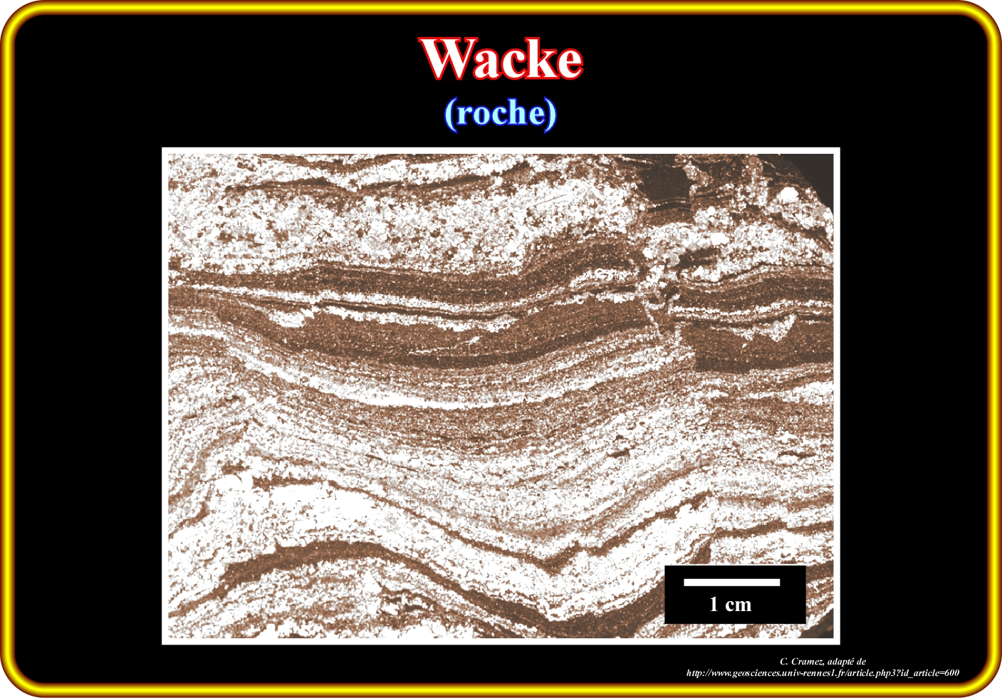 Comme illustré sur cette figure un wacke, comme tous les grès, contient du quartz, mais, aussi, d'autres minéraux et même de petits fragments de roches Un wacke est ce que certains géoscientistes anglo-saxons appellent grès sale ("dirty sandstone"), qu'ils définent comme une roche sédimentaire composée de grains de sable, de taille moyenne de 0.06 à 2 mm, et une matrice d'argileuse, relativement, mince. Les grains de sable sont issus de fragments de roches très différent. Ainsi, la présence de pyroxènes, amphiboles, feldspaths, micas, etc., est très répandue. Les grains sont anguleux et mal triés, avec de nombreux minéraux qui conservent, encore, les formes de croissance, ce qui suggère un faible abrasion et météorisation. La matrice, qui contient des quantités appréciables de minéraux argileux, qui peuvent former jusqu'à 50 pour cent du volume. Des minéraux argileux, chlorite et biotite sont plus abondantes que la muscovite et illite (la kaolinite est presque toujours absent). Un grauwacke est un type particulier de wacke, qui se traduit, actuellement, par une origine, composition et texture particulière. Le terme grauwacke ("grauwacke" en anglais) était le nom que les mineurs allemands des montagnes du Harz (centre de l'Allemagne, Saxe), utilisaient pour désigner les roches sans veines de minerai, lesquelles ont été décrites comme des grès du Paléozoïque gris à vert foncé, très indurés et très riche en fragments d'autres roches et avec une matrice d'argile compacte. En effet, un grauwacke se dépose dans les parties profondes des bassins sédimentaires, mais non loin des chaînes de montagnes. Cela signifie que les rivières et les ruisseaux de la montagne transportent de sédiments grossiers, mais relativement frais, puisque un rapide transport ne permet pas une altération significative. Lorsque ce type de transport sédimentaire atteint la ligne de côte et le bassin n'as pas de plate-forme continentale, il est transporté vers les parties profondes du bassin par des courants de turbidité (induites par une chute relative du niveau de la mer ou par l'inondation des rivières), où il déposé sous la forme de cônes turbiditiques .