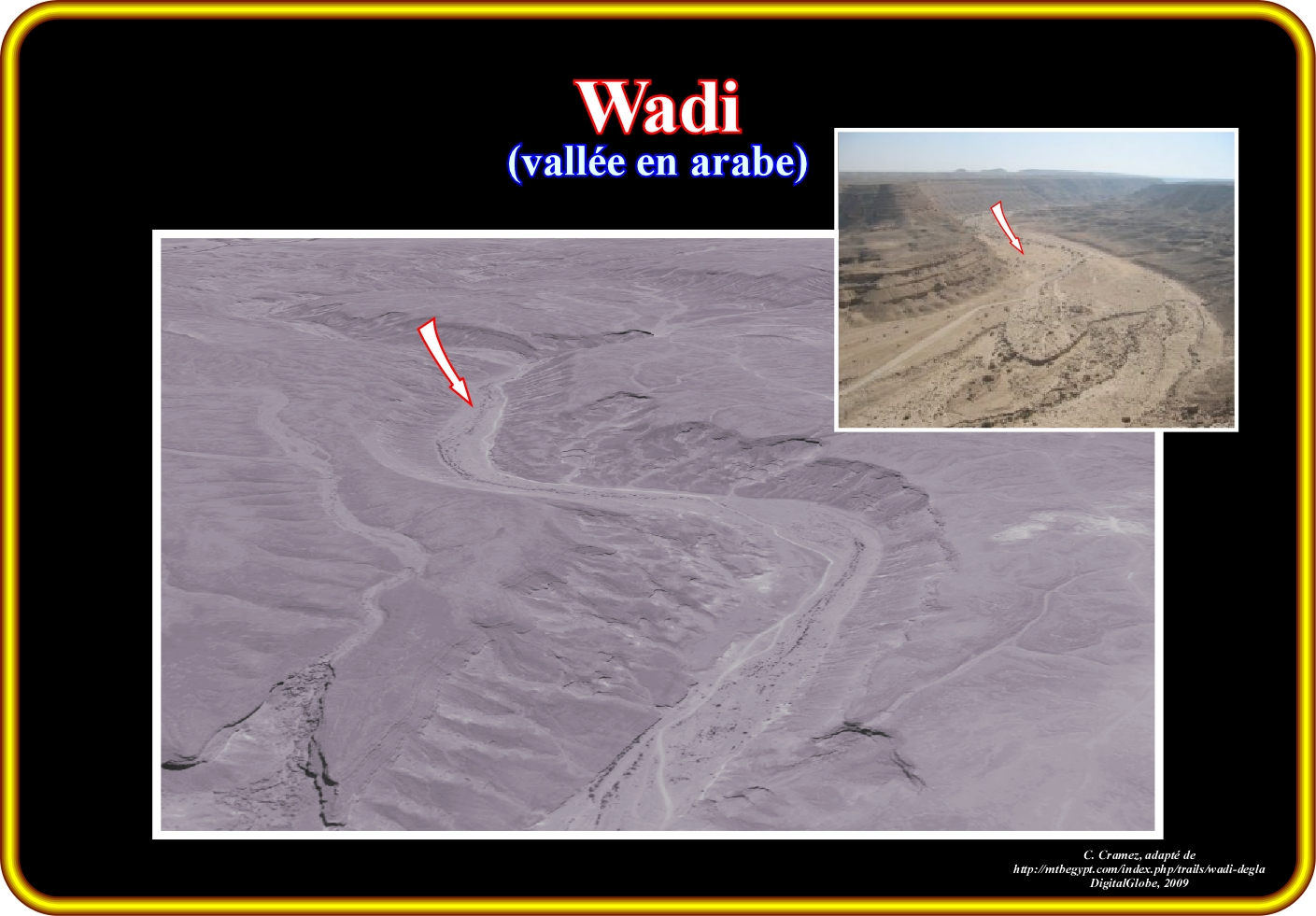 Cette photographie illustre la vallée Degla, qui est situé dans la partie nord du désert oriental d'Egypte, non loin du Caire. Cette vallée particulière, une fois que le courant du Degla courant n'est présent que lors des grandes pluies, a une longueur d'environ 30 kilomètres et est orientée, plus ou moins, perpendiculairement à la vallée du Nil, où il finit, au sud de la ville de Maadi. Tout courant est un cours d'eau, qui canalise le ruissellement. Conventionnellement, la ligne médiane de tout courant, où les deux c^tés de la vallée s'interceptent c'est le talweg. Bien que le courant n'existait pas quand cette photo a été prise, il est relativement facile de deviner la position du thalweg. Les courants d'eau, quand permanentes, ont des noms différents en fonction de la taille et de son comportement. Ainsi, une rivière est un écoulement importante, tandis qu'un ruisseau est un courant qui est plus petit mais plus grand que un ru. Les courant non permanents sont les torrents (écoulement d'eau rapide et impétueux qui vient de fortes pluies ou de la fonte soudaine de neige), qui disparaissent pendant les saisons sèches. Dans les zones désertiques, par exemple, dans le région où cette photo a été prise, les torrents creusent des fonds sub-horizontales et des vallées escarpées formant ce que les Espagnols appellent «arroyos» et les Arabes "widian" (pluriel de "oued"). Le dépôt dans un oued est très rapide en raison de la perte soudaine de la vitesse du courant et de l'infiltration de l'eau dans le substratum poreux. À ce sujet, nous rappelons d'avoir traversé, en jeep, difficilement un oued dans la région de Keruam (Tunisie), pour aller dormir à l'hôtel. Le lendemain, quand nous nous sommes levés, son passage était beaucoup plus facilement, une fois que pendant la nuit, une trompe d'eau a complètement rempli l'oued de sédiments. Les dépôts des oueds sont presque toujours constitués de sable et blocs mal calibrés, qui, ensuite, sont retravaillés par le vent.