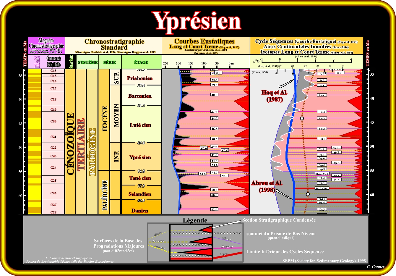 La limite du strato-type Yprésien / Lutétien est basée sur un événement qui peut être en corrélation avec la base du Lutétien (stage standard de l’Éocène). Le Lutétien a été défini par De Lapparent, en 1883, et révisée en 1983 par Blondeau qui a proposé un nouveau stratotype, à environ 50 kilomètres au nord de Paris. Le concept de stage Yprésien ou système Yprésien, comme certains géoscientistes disent, a été introduit par A. Dumont, en 1849, pour spécifier les argiles marines et les sables glauconitiques sus-jacents qui se trouvent dans la région d'Ieper dans l'ouest de la Belgique. Dumont n'a pas mentionné le stratotype ou la localité type. Ce concept qui a évolué au cours des XIXe et XXe siècles, diffère de la GSSP qui a été ratifiée en 2003 en Dababiya (Egypte). Le Yprésien a duré entre 55.8 (± 0,2) Ma et 48.6 (± 0,2) Ma et représente le plus ancien stage standard de l’Éocène. Pendant Yprésien, après le maximum thermique de l’Eocène Initial, le territoire actuel de la Belgique était couvert par une mer épicontinentale, dont le niveau de la mer a souffert plusieurs variations relatives. Pendant le Yprésien Initial, les conditions géologiques était de haut niveau marin. Dans extrême NO de la Belgique, sous une profondeur d'eau de plus de 200 mètres, existaient des conditions anoxiques. Vers la côte, c'est-à-dire, au Sud et au Sud-Est, les conditions bathyales anoxiques ont, progressivement, changé vers des condition littoraux (50-100 m de profondeur d’eau bien oxygénée). Ainsi, une mer peu profonde recouvrait la région du sud (Bruxelles-Lille), jusqu’au flanc nord des Ardennes, qui a formait la ligne de côte. Au cours de l'Yprésien Tardif, le climat subtropical de l'Yprésien Initial a continué, bien que avec une augmentation de température connue sous le nom OCEI. Le niveau de la mer, bien que soumis à des changements substantiels, était beaucoup plus bas que dans l’Yprésien Initial, et la ligne de côte a avancée vers nord d'environ 200-250 km. Le bassin de Paris a émergé de façon permanente dans le cadre du bassin de Londres-Hampshire, tandis que le bassin Belge a été couverte par une mer peu profonde, ce qui a permis le dépôt d'une alternance de sédiments sableux et argileux. Les dépôts de l’Yprésien correspondent à une alternance d’argiles et grès, dans laquelle plusieurs cycles-séquence se sont déposées à la suite de l'interaction entre l’eustasie et tectonique, et où les sables glauconitiques caractérisent les cortèges transgressifs.