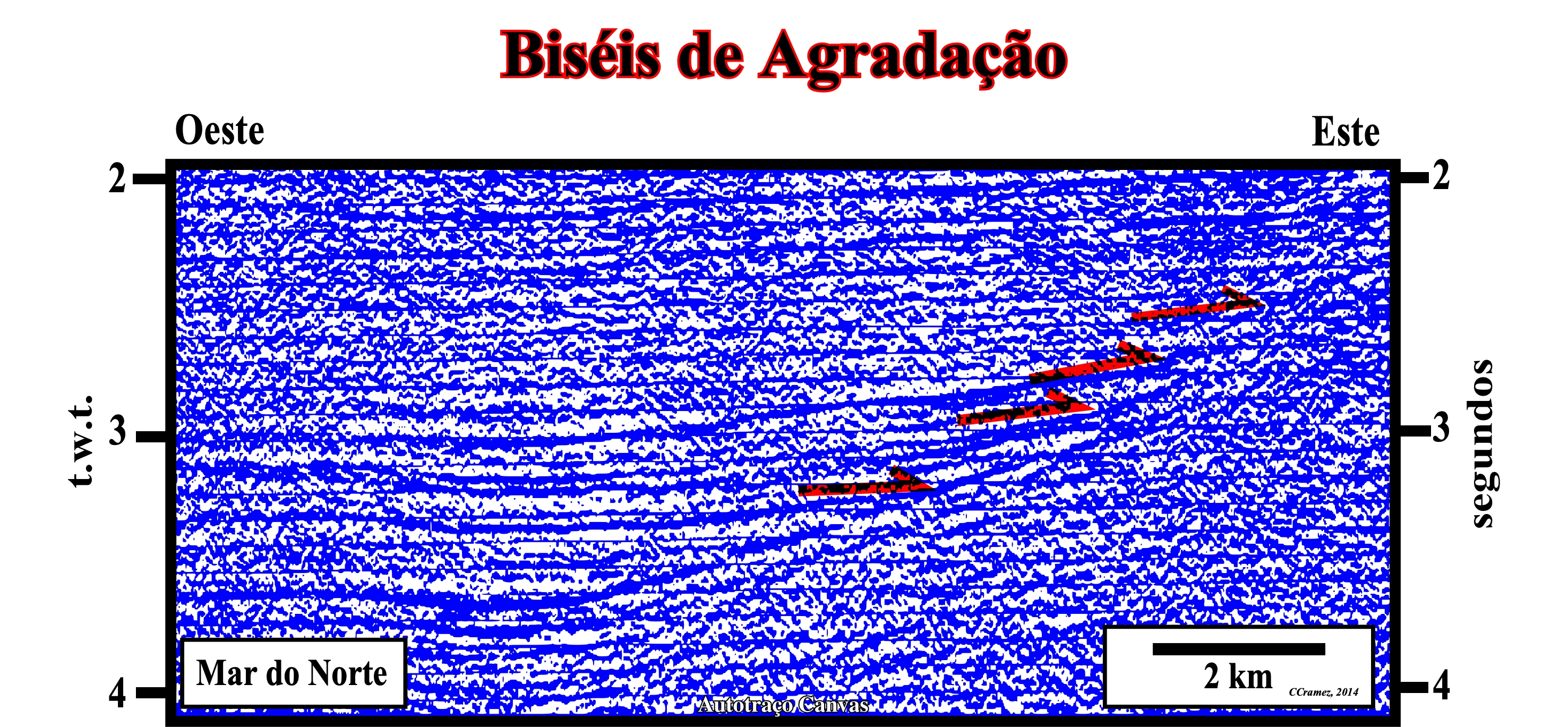 As linhas sísmicas podem ser interpretadas em termos geológicos desde que os geocientistas assumam que os reflectores sísmicos correspondem, aproximadamente, a linhas cronoestratigráficas, ou seja, a superfícies estratais. Nesta linha sísmica do mar do Norte, os sedimentos da bacia cratónica (o offshore do mar do Norte é constituído por uma bacia cratónica que se depositou por cima de bacias do tipo rifte) repousam sobre os sedimentos da bacia de tipo rifte por biséis de agradação. As relações geométricas definem uma superfície de biselamento que fossiliza a discordância (superfície de erosão)que existe entre entre a bacia de tipo-rifte e a bacia cratónica. Tendo em conta a amplitude da agradação (assoreamento) e da invasão continental dos sedimentos, pode dizer-se que os sedimentos se depositaram na bacia cratónica sob lâmina de água importante, provavelmente, em associação com correntes marinhas de gravidade (correntes turbidíticas).