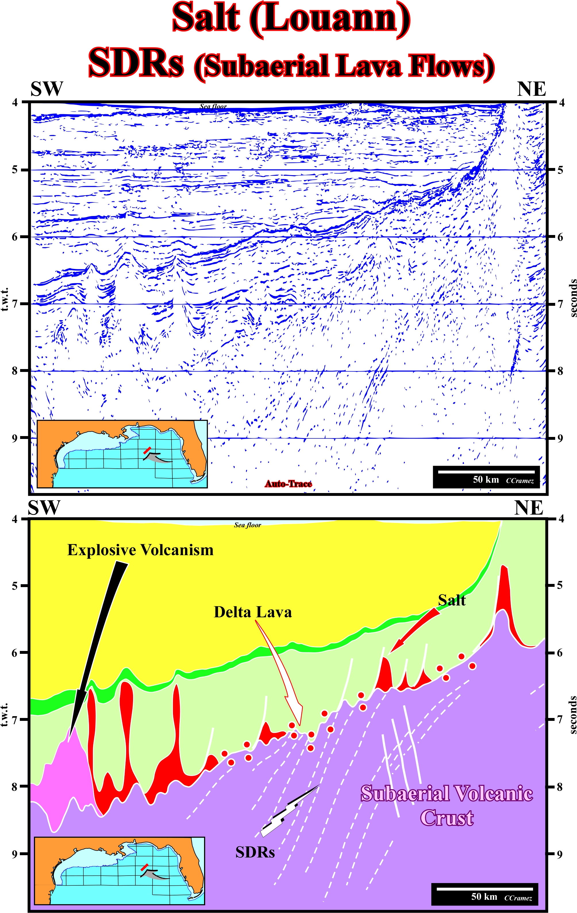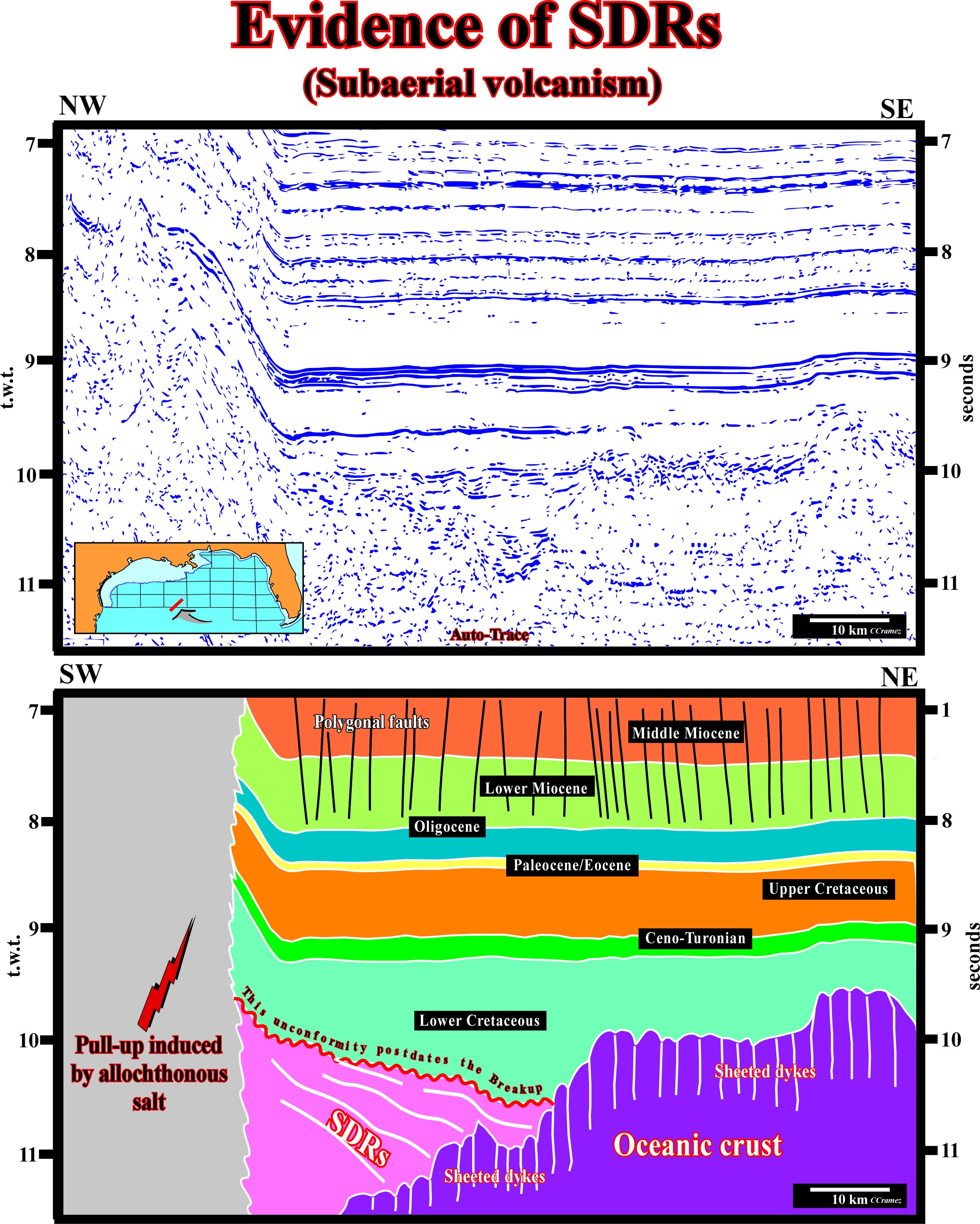 Fig. 320 - This composite tentative geological interpretation of a seismic line across the Gulf of Mexico corroborates the hypothesis of a volcanic-margin type of opening for the Gulf. There is a strong evidence of volcanic structures, which lateral succession suggests a progressive drowning of the spreading centres. On the tentative, the transition of the sub-aerial crust (SDRs) to the oceanic crust (sheeted dykes) is quite plausible. Above the volcanic crust it is, easily, to recognize a Mesozoic Mediterranean-type basin overlain by a Cenozoic non Atlantic-type divergent margin. In the middle of the seismic line, the distal part of the deep-water Mississippi fan is obvious to the eye.