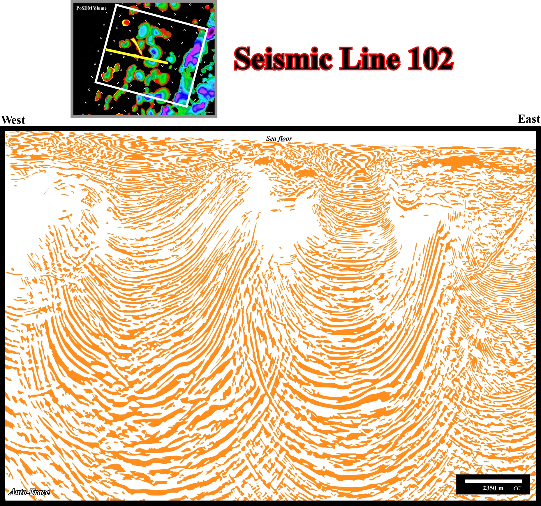 Fig. 368- Notice that on this map of the base of the allochthonous salt, the blue colors are deepest and the red colours are shallow. Please propose tentative geological interpretations of following W-E seismic lines and time slices.