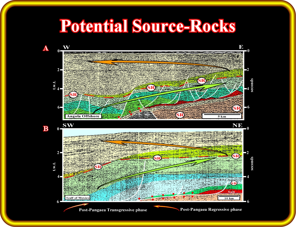 Upper Cretaceous potential source-rock intervals in (A) offshore Kwanza Basin, and (B) offshore Gulf of Mexico are obvious. The backstepping transgressive phase of the post-Pangaea continental encroachment stratigraphic cycle is limited at the top by a major downlap surface. This surface marks the time of maximum flooding of the margins when primary marine source rocks accumulated. This phase is followed by the progradational regressive phase. Each continental encrochment cycle comprises several subcycles, within which secondary marine source rocks are associated with minor downlap surfaces. The occurrence of source rocks is, mostly, unrelated to the salt tectonics.