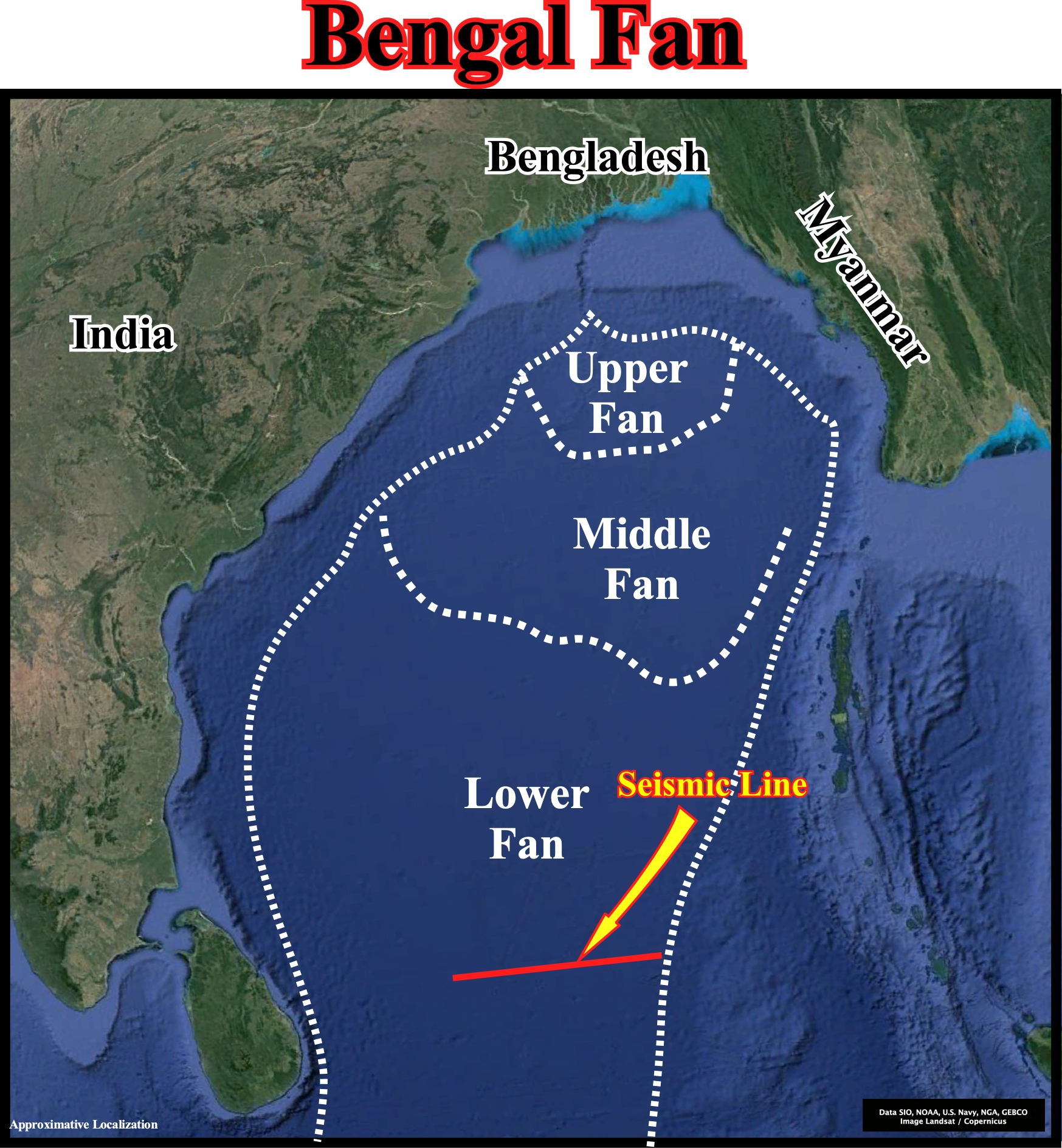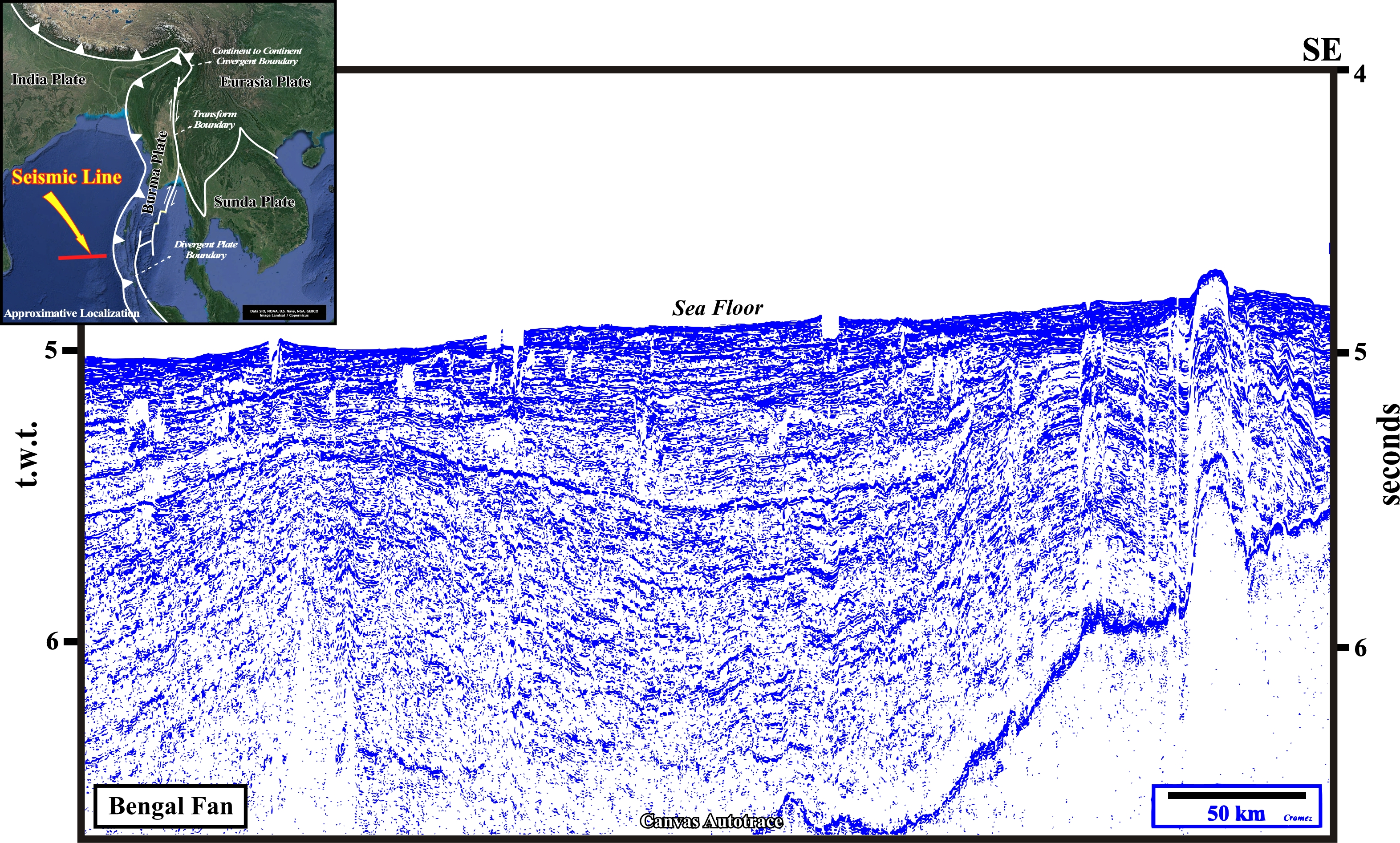 This plate illustrates the approximative extension of the Bengal fan, located between the eastern India offshore, which corresponds to the stacking of rift-type basins and an Atlantic-type divergent margin, and the B-type subduction zone bordering the Burma lithospheric plate. The upper, middle and lower fan are delimited, roughly, as well the location of the next Canvas autotrace, which recognizes, mainly, the lower Bengal fan.