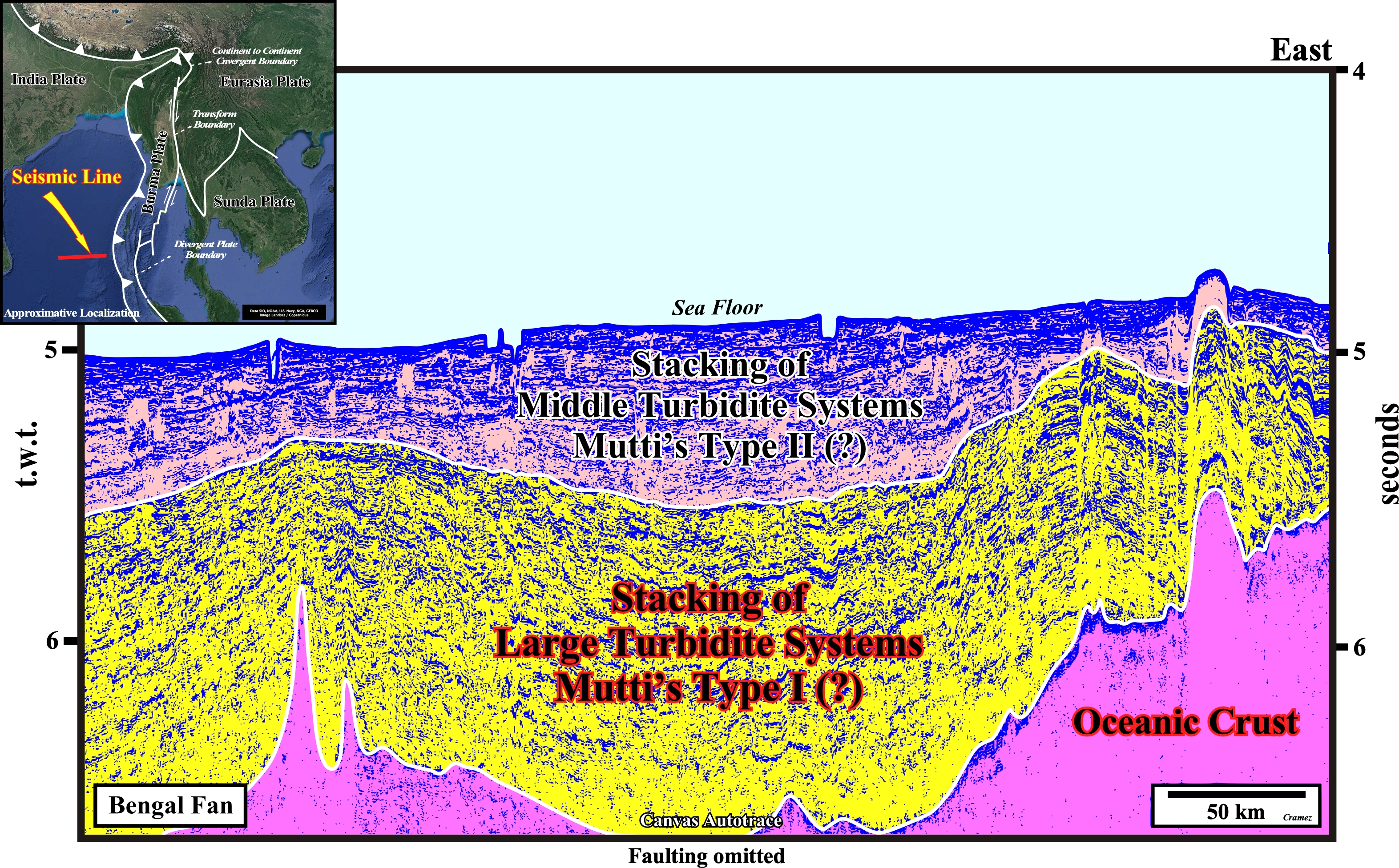 This Canvas autotrace can be tentatively interpreted as composite by three seismic intervals : (i) A basement formed by oceanic crust ; (ii) A stacking of large turbidite systems (Type I in the Mutti's model), which corresponds, roughly, in P. Vail's model to distal submarine basin floor fans and (iii) A stacking of middle turbidite systems (Type II in E. Mutti's model), which in Vail's model correspond, more or less to distal submarine slope fans.