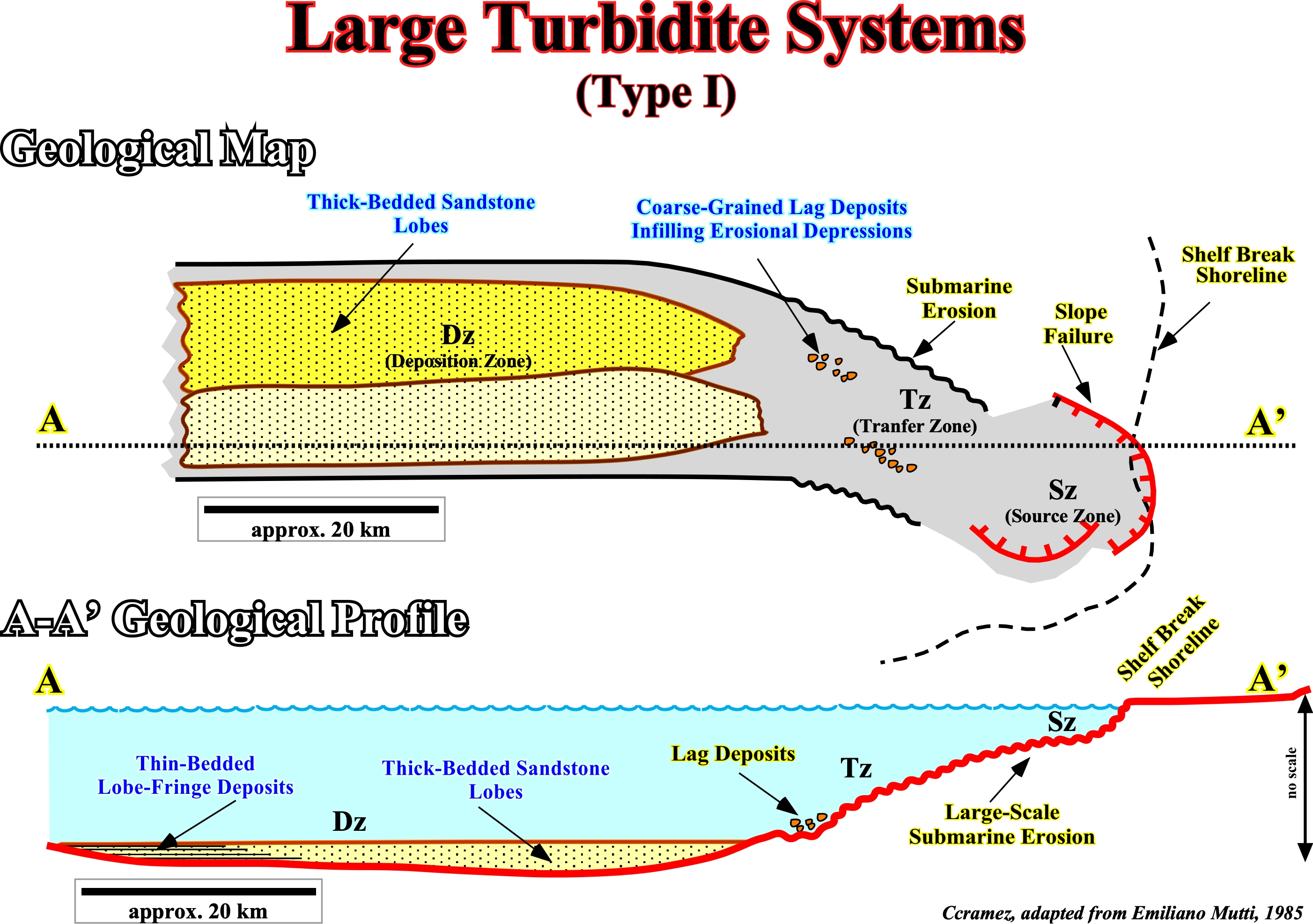 Assuming that the turbidite currents have a high degree of freedom, i. e., in absence of effective obstacles along the slope, the turbidite deposits can be : (i) Large Turbidite Systems ; B) Middle Turbidite Systems, and C) Small Turbidite Systems., based either on the volume and texture of the gravity flow (sand-rich / mud-rich systems or type I, II and III of Mutti, 1985) or linked to the physiography of the margin and predominant sediment granulometry of coastal systems (Reading & Richard, 1994). Such a classification takes into account the "efficiency" concepts of Mutti (1979) and it corresponds to classification that he proposed in1985: (A) Type I, mainly composed of tabular lobes ; -(B) Type II, mainly composed of transition channel-lobes and (C) Type III, composed mainly of channel-levee complexes. Above, it is illustrated the geological model of the Large Turbidite Systems (Type I), which is characterized by a large zone of non-deposition with by residual deposits between the continental slope and the most proximal part of the abyssal plain, and, seaward, thick-bedded sandstone lobes and thin-bedded lobe-fringed deposits. This geological model can make plain and comprehensible the yellow seismic interval of the previous tentative interpretation, in which the following geological features are likely: a) The main depositional zone is located in the abyssal plain ; b) The bulk of sandstones occur in non-channelized and elongated lobes in the outer area of the system ; c) The potential sand-prone reservoirs have a tabular geometry with tens of kilometers of extension ; d) The individual strata thickness range between 0.5 - 2 m ; e) The thickness of each lobe, commonly ranges between 3-15 m thick ; f) The total thickness of each system can reach 50-100 m with a sand/shale ratio (N/G around) of 50% ; g) Each lobe is thick-bedded and grades seaward into thinner bedded and finer grained deposits ; h) They create huge morphologic traps with large four way dip closures, etc.