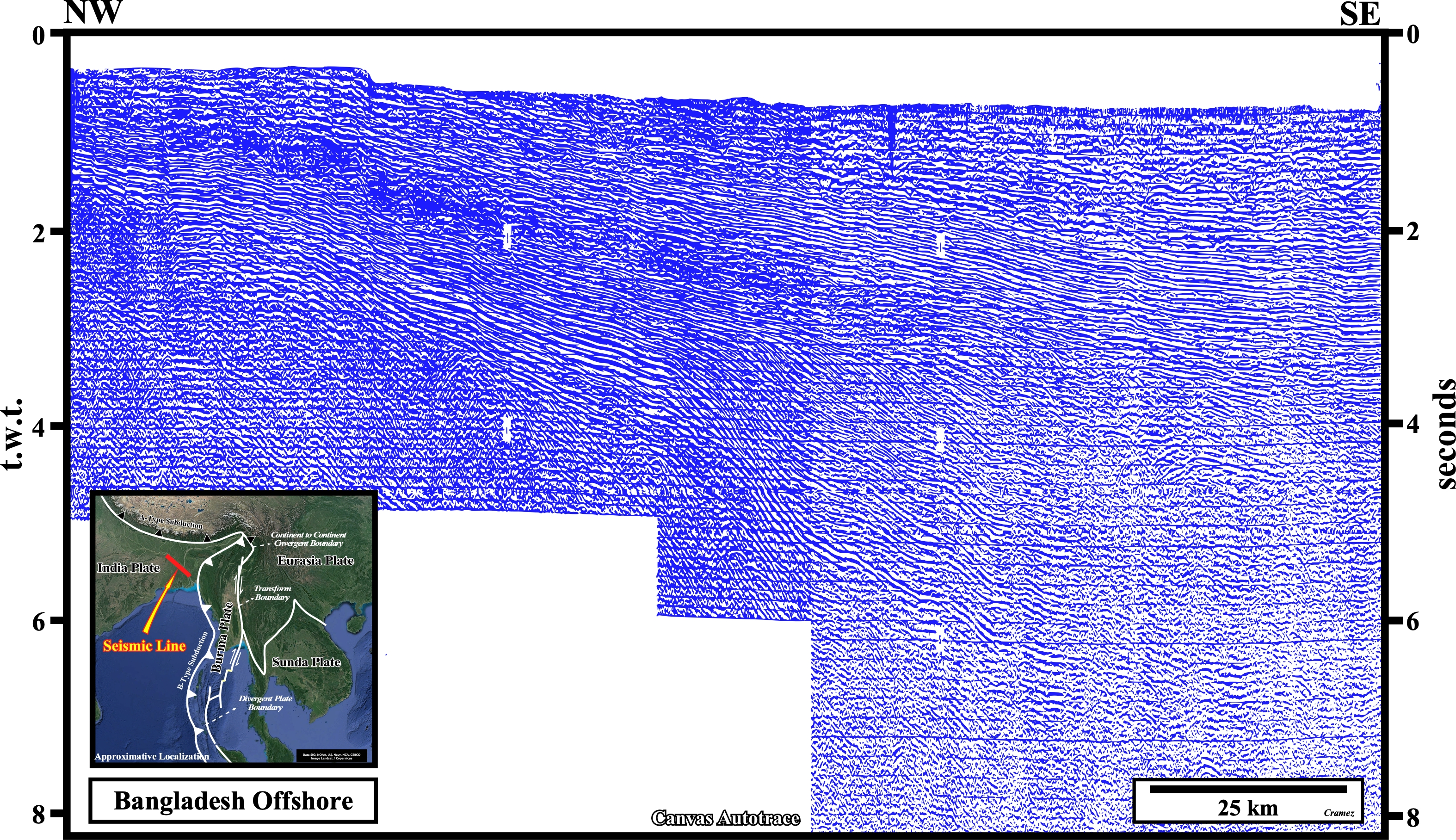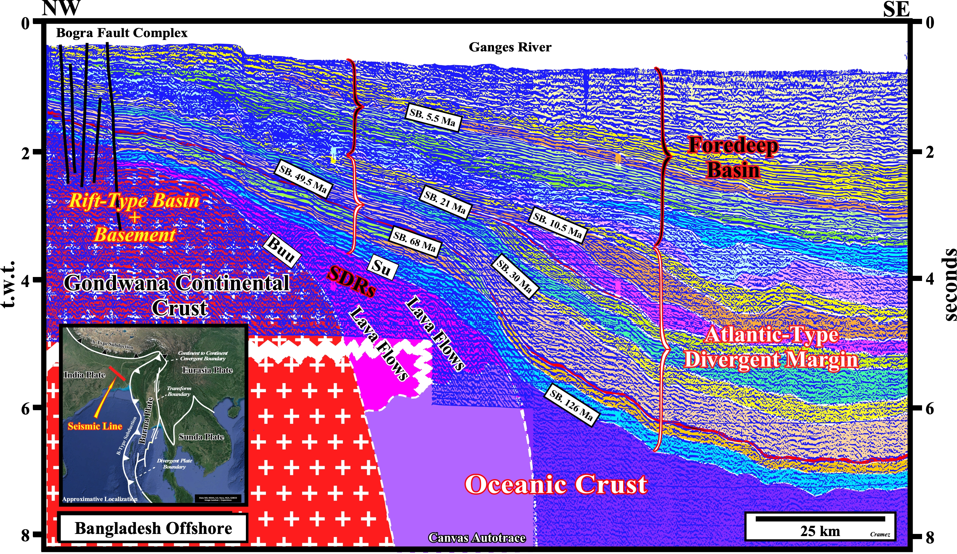 On the location map, we can see the A-type subduction zone between the Indian and the Eurasian plate, as well as, the B-type subduction zone between the western Indian plate and the Burma plate. The old seismic line of this Canvas autotrace is located on the onshore between these two subduction zones. The "Buu" unconformity, i.e., the breakup unconformity of the Gondwana continental crust, which separates the rift-type basins from the overlying Atlantic-type divergent margin, is recognized, easily, since it is fossilized by lava flows (SDRs) forming the sub aerial volcanic crust of the eastern India margin (before the immersion of the expansion centers, which marks the onset of the oceanic crust). The "Su" unconformity highlights the top of SDRs. Above the volcanic crust, the post Pangea continental encroachment stratigraphic cycle, induced by the second 1storder Phanerozoic eustatic cycle, was deposited. However, at Upper Miocene, the Atlantic-type divergent margin is covered by a foredeep basin induced by the A-type subduction zone associated with the Paleogene collision between the Eurasian plate with the Indian plate, which disengaged from the Gondwana small supercontinent in the Early Cretaceous.