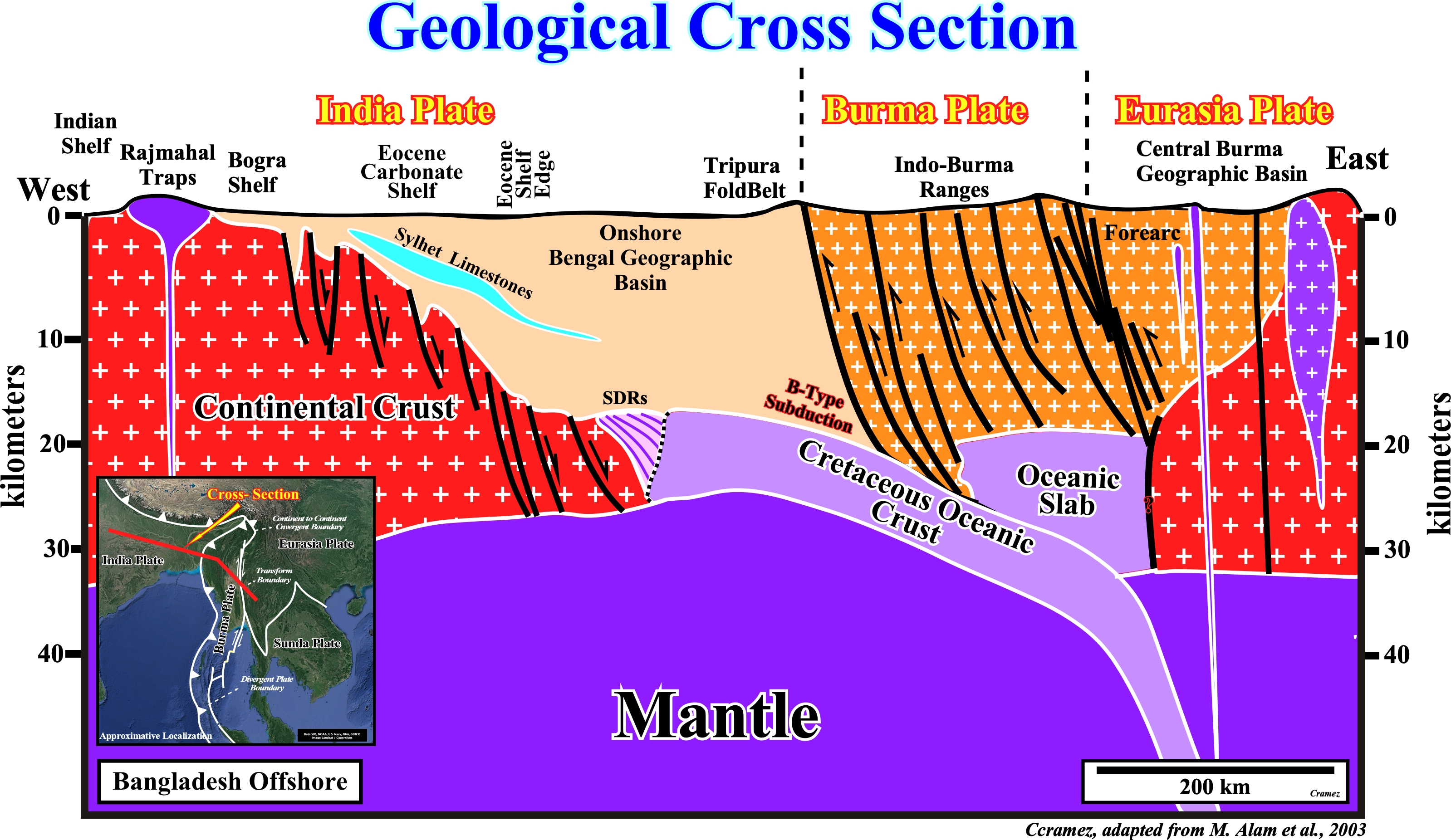 On this geological cross section, the collision between the Eurasia, Indian and the Burma plates is, here, underlain by a B-type subduction (Benioff) in which the Cretaceous volcanic crust (sub-aerial, i.e., SDRs and oceanic) of the Indian plate plunges under the Eurasian Plate (see SDRs in next plate). However, the Bengal geographic basin corresponds, mainly, to a foredeep basin (perisutural basin built up at the periphery of the megasuture, in association with the A-type subduction of the Indian and Eurasian plate) and, partially to a fold belt (Tripura fold belt) induced by collision of the Indian plate with the Burma plate (Burma ranges).. The Central Burma geographic basin, located in the Eurasia plate, and individualized from the Burma plate by a transform boundary, corresponds to the forearc basin originated, probably, by the B-type subduction of the Indian Cretaceous oceanic crust.