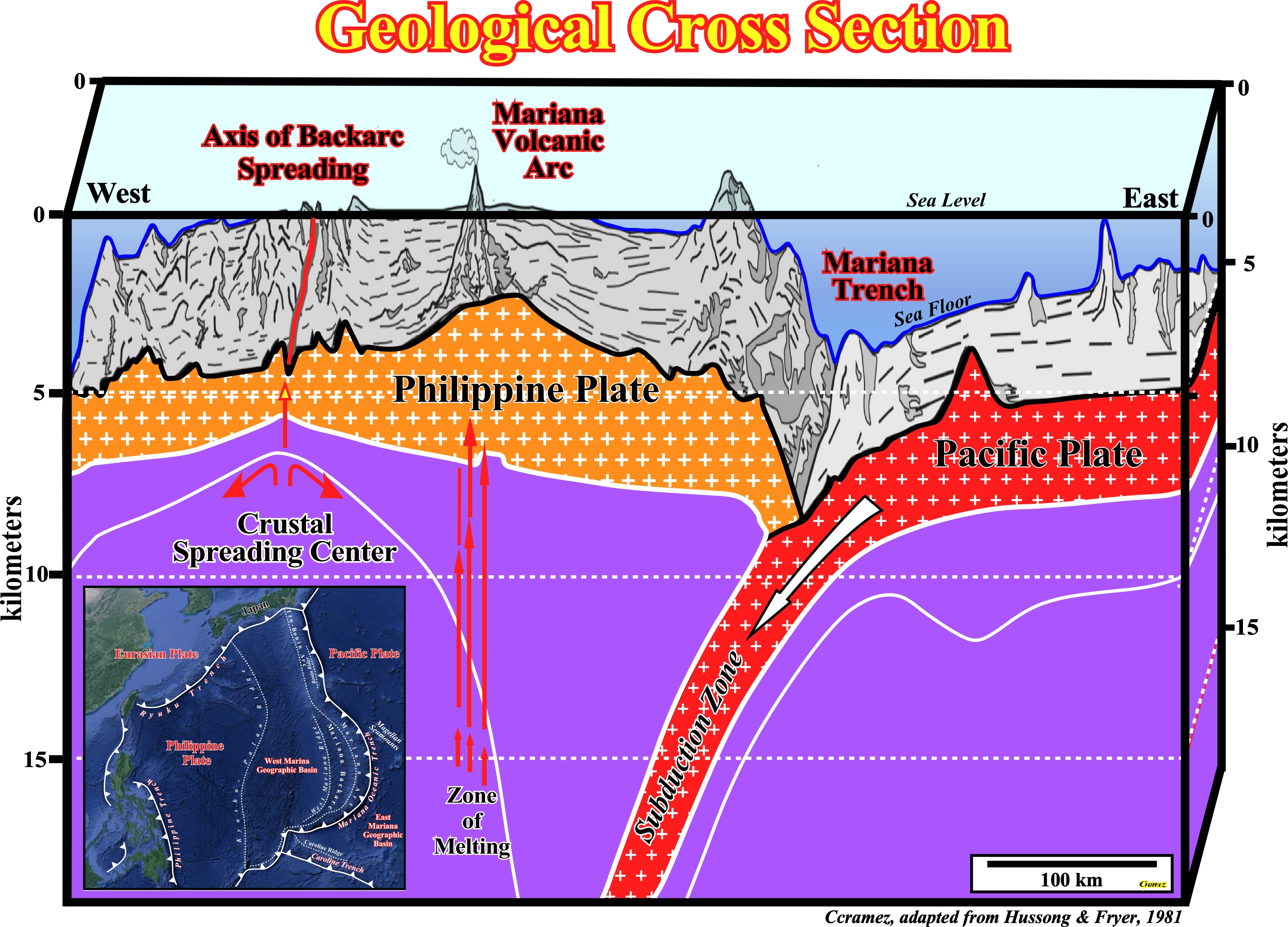 The Mariana Trench is part of a global network of deep troughs that cut across the ocean floor. It was formed, as illustrated on this geological sketch, when the Pacific lithospheric and the Philippine lithospheric plates collide, that is to say, that at the collision point, the Pacific plate (descending plate) plunge beneath the Philippine plate (overriding plate ) into the Earth’s mantle. Attention to the terms "collide " and "collision" here used, since in the plate tectonics and unlike the collision of a car against a wall, the kinetic energy plays no important role, i.e., in the plate tectonics there is no transformation of kinetic energy in strain energy. The depths of the Mariana Trench were first plumbed in 1875, during the first global oceanographic cruise, as more or less eight kilometers, using a weighted sounding rope. However, in 1951, the British vessel H.M.S. Challenger II returned to the spot with an echo-sounder and measured a depth of nearly 11 kilometers.
