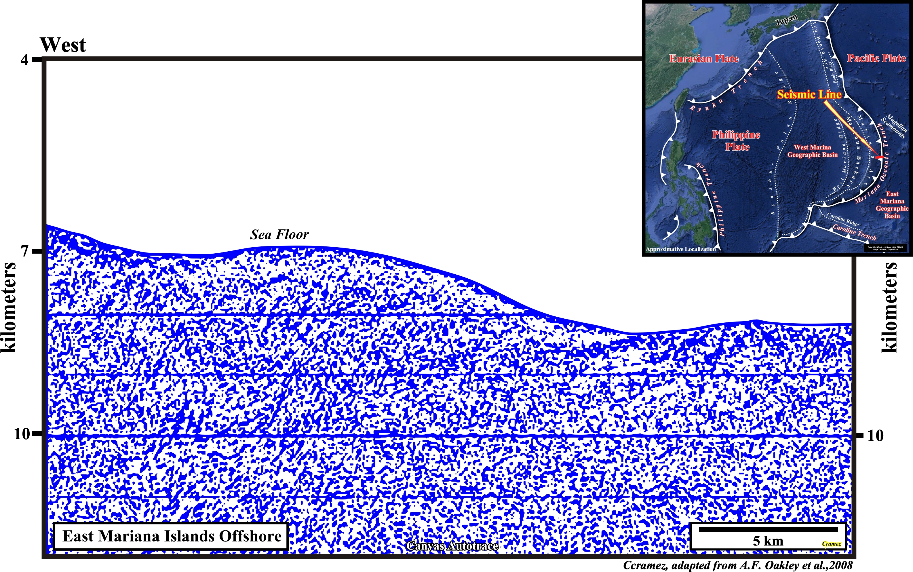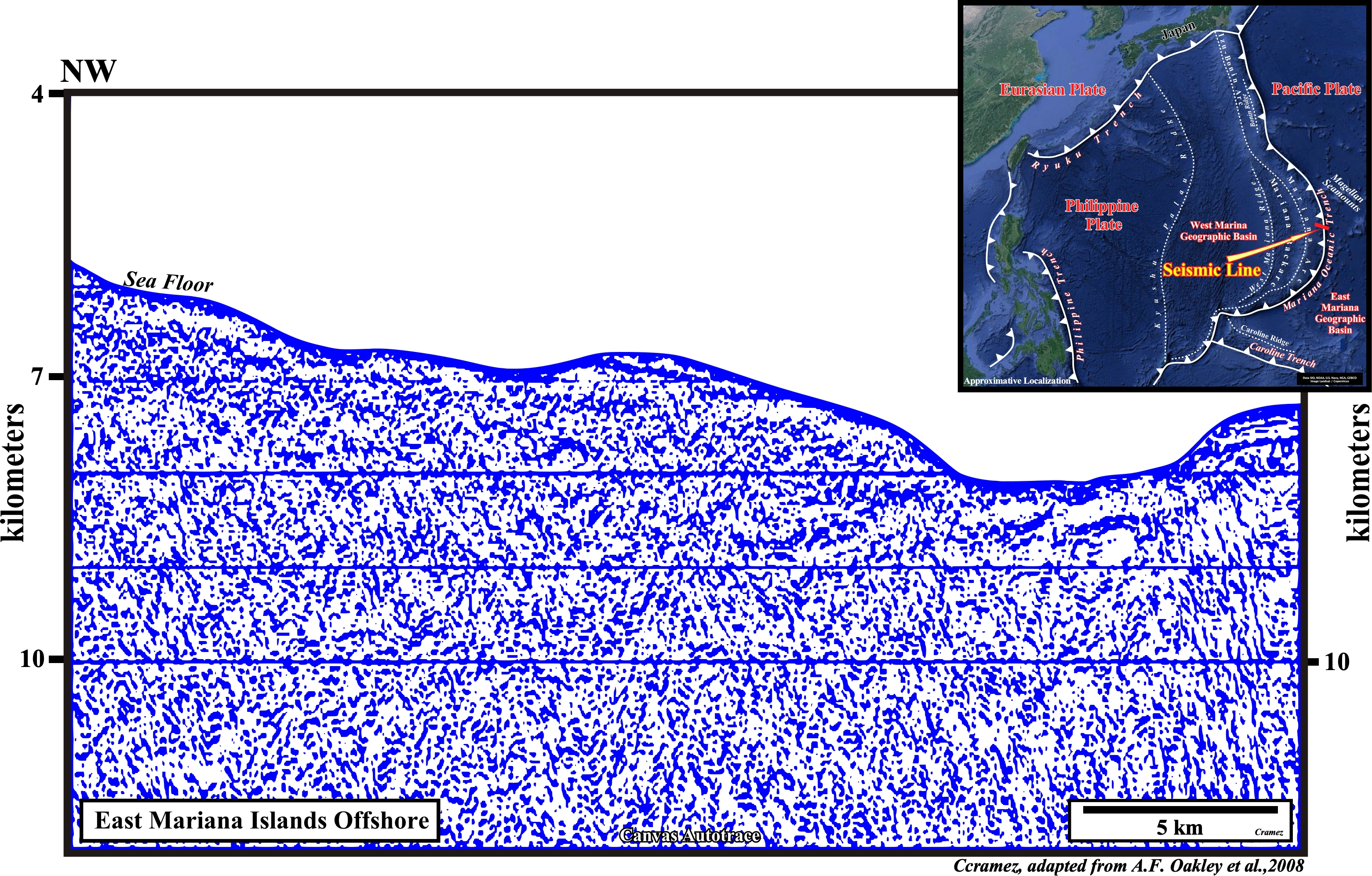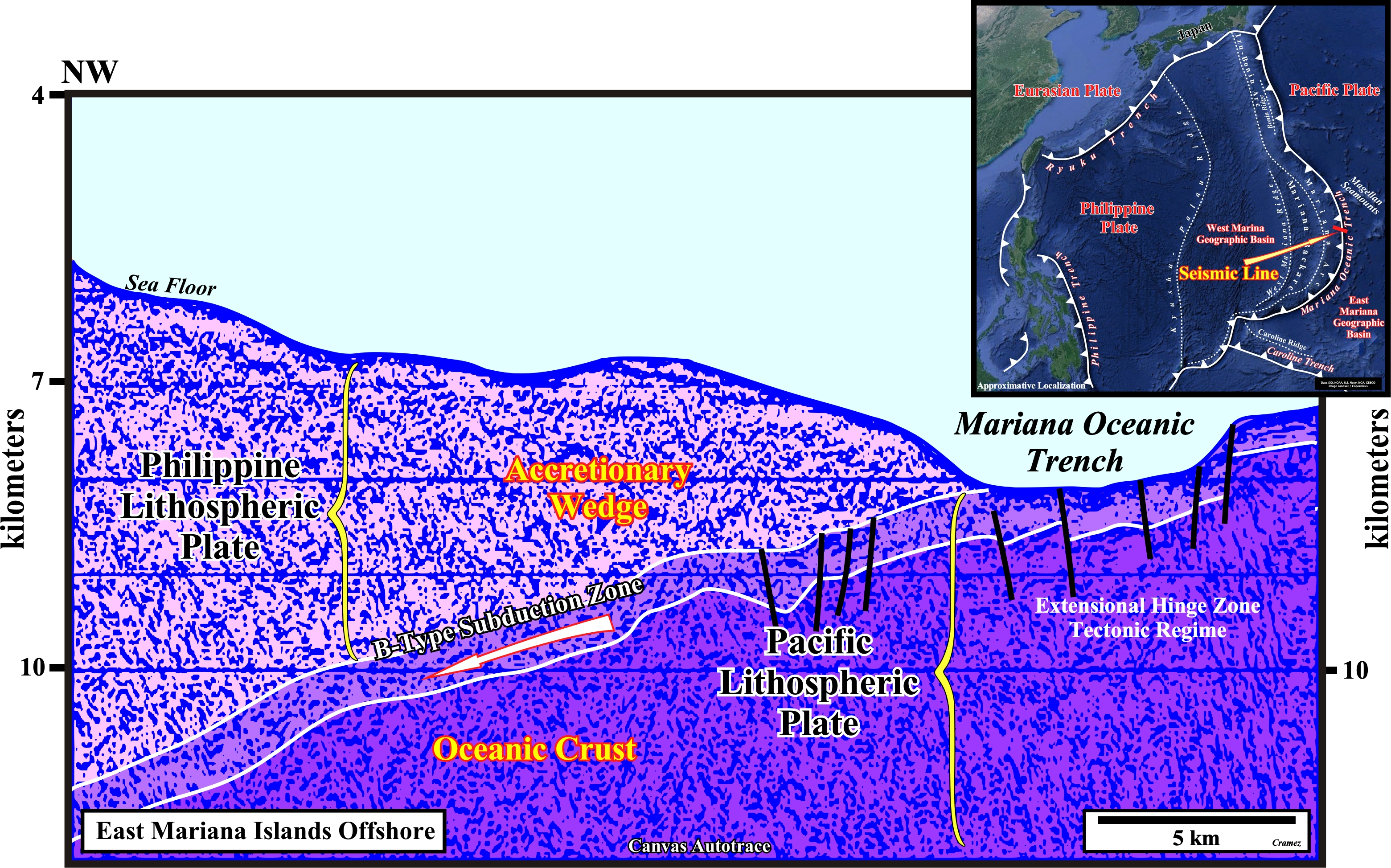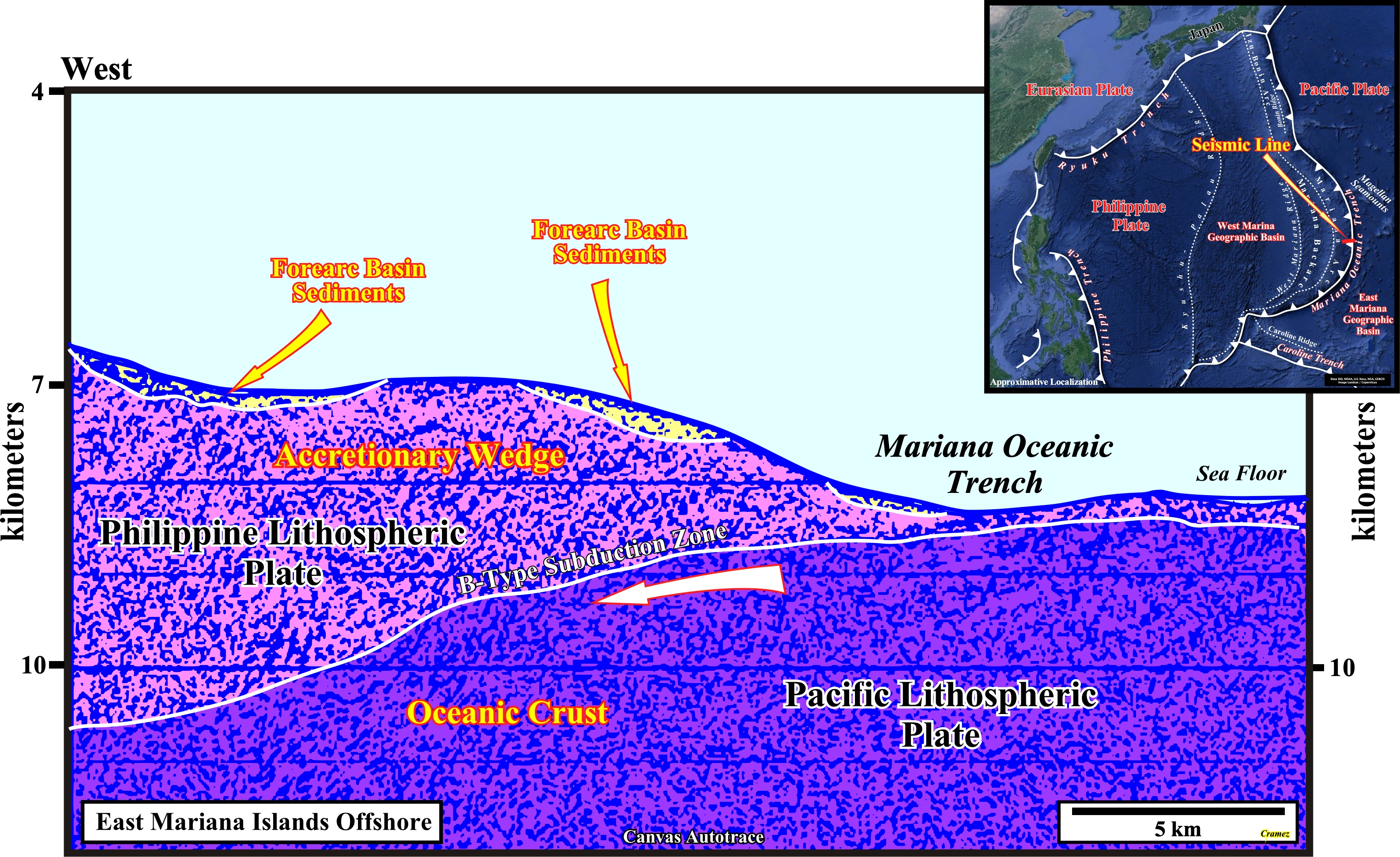 On this Canvas autotrace, the Mariana trench is evident, as well a the two lithospheric plates forming the B-type subduction. The Pacific plate is the descending plate and the Philippine plate is the overriding plate in which an accretionary wedge is formed. The shortening of the accretionary wedge contrasts with the lengthening of the Pacific plate near the hinge of the descending plate which emphasizes the Mariana trench, which is not always so clear as illustrated o the next Canvas autotrace.