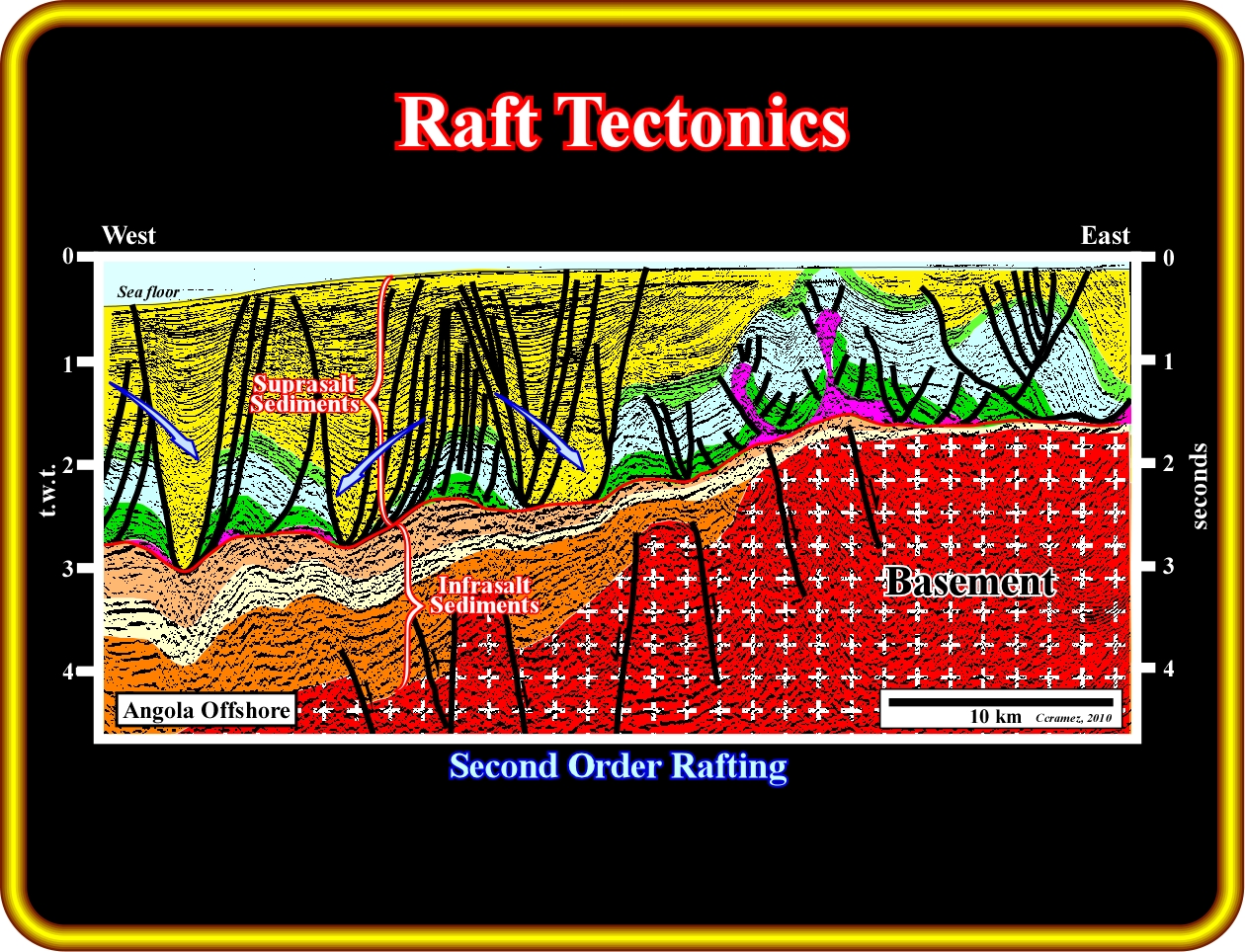 As illustrated on this tentative geological interpretation of a seismic line of the conventional Angola offshore, this offshore (Kwanza basin) correspond to the superposition oof different sedimentary basin : (1) Paleozoic fold belt or basement (2) Upper Jurassic-Lower Cretaceous rift type basins and (3) Meso-Cenozoic divergent continental margin. Within the divergent margin a salt layer alloe geoscientists to subdivide the stratigraphic column into two major intervals : (i) Infrasalt sediments and (ii) Suprasalt sediments, which are separated by a salt induced tectonic disharmony (underlined by a continuous red line). In the suprasalt sediments the combination of halokinesis and gravity gliddings create salt welds and rafts (second order rafts on this particular example), which are characteristics not only of this offshore, but the majority of the South Atlantic salt margins.